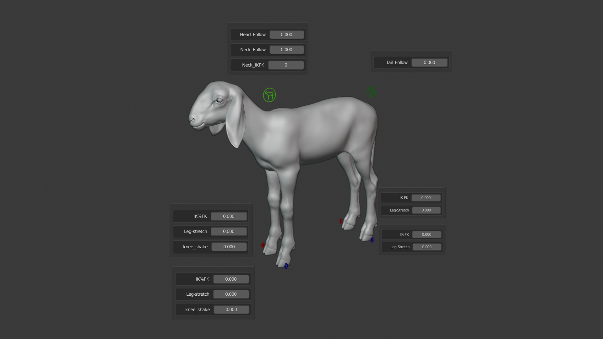 CTR_Leg_F_Other.L and CTR_Leg_F_Other.R control the switch of IK/FK of the forelegs by the customized attribute IK-FK, which is non-seamless; Leg-stretch controls the stretch limit of the legs; Knee_shake is to solve the knees jitter during animation.