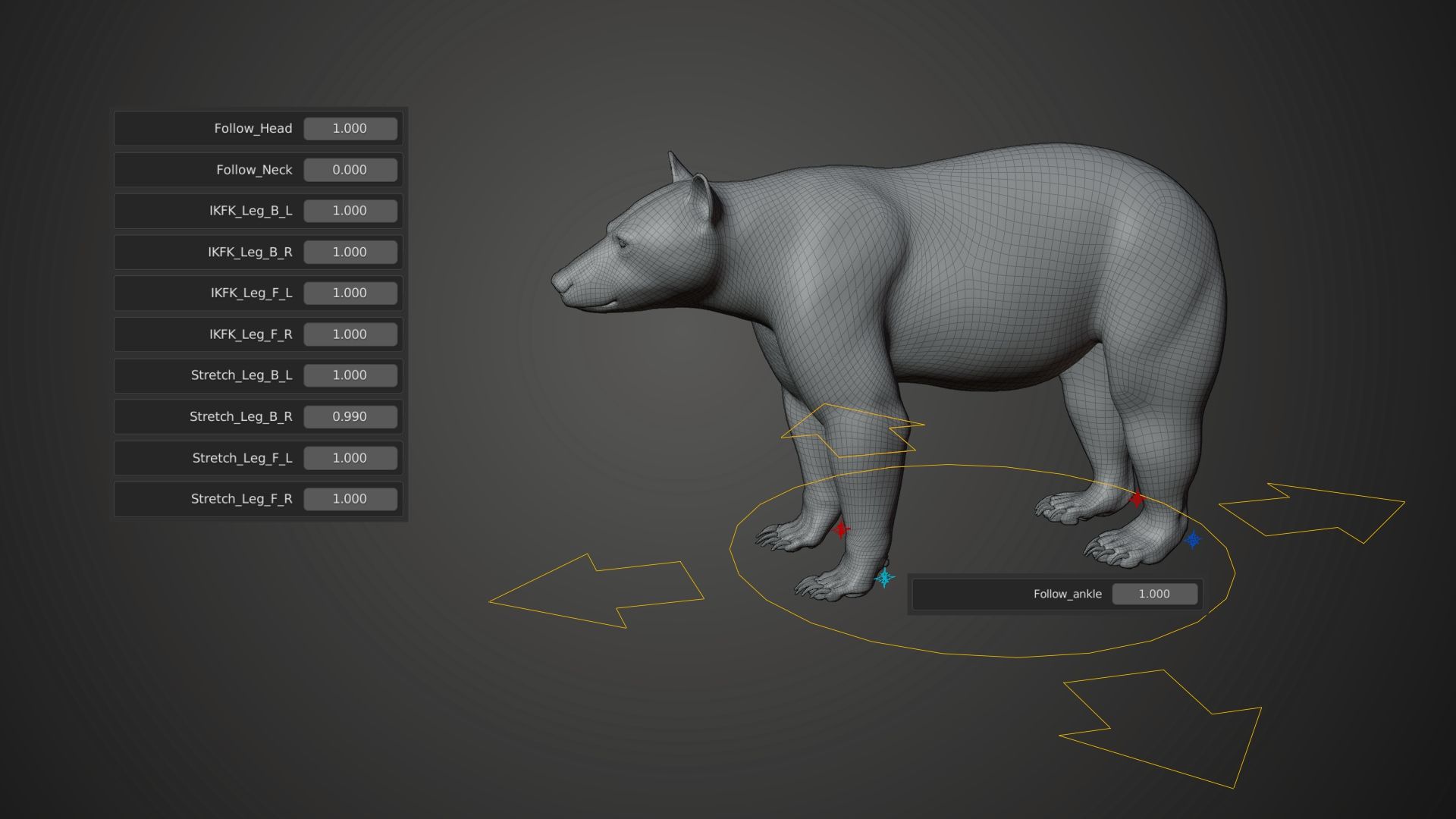 CTR_root controls the movement of the entire model, and its customized attribute Follow_Head controls whether the head moves following the parent controller; Follow_Neck controls whether the neck moves following the parent controller; IKFK_Leg_B_L, IKFK_Leg_B_R, IKFK_Leg_F_L and IKFK_Leg_F_R are to switch between IK/FK of the limbs, which is non-seamless; Stretch_Leg_B_L, Stretch_Leg_B_R, Stretch_Leg_F_L and Stretch_Leg_F_R control the stretch limit of the limbs.