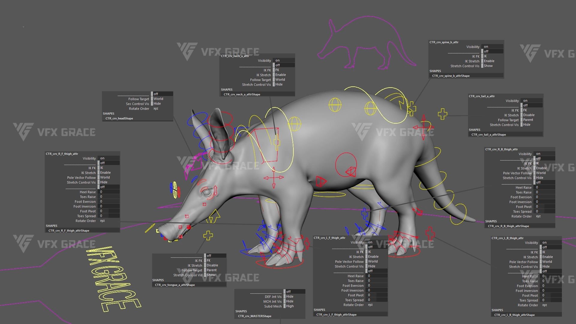 CTR_crv_MASTER: Controls the entire model, with customized attributes: "DEF_Jnt_Vis" (Deformation Joint Visibility), "MCH_Jnt_Vis" (Mechanism Joint Visibility), and "Subd_Mesh" (Subdivision Mesh visibility).