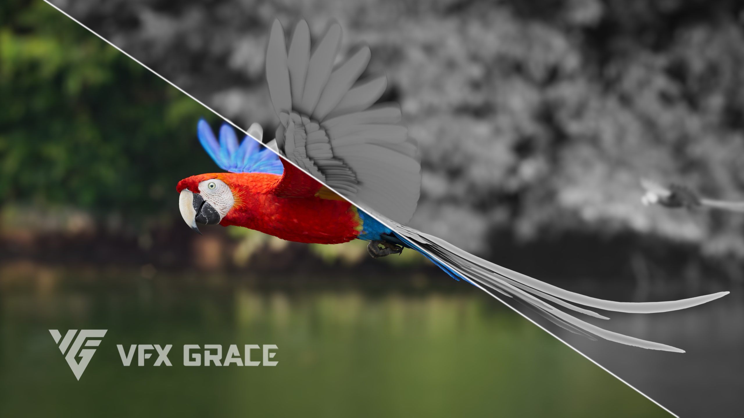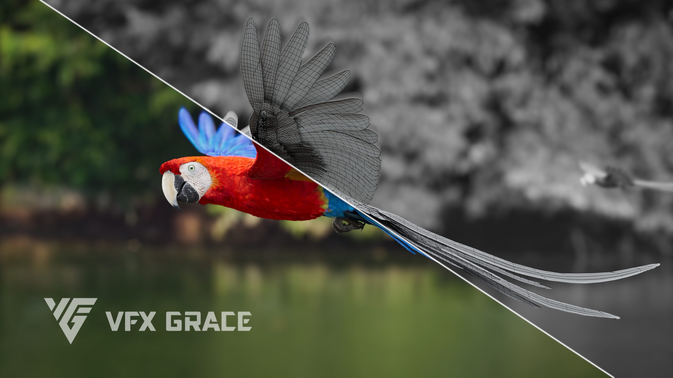 Feathers and fur: The feather system combines feather cards and fur simulation, recreating the scarlet macaw's realistic plumage.