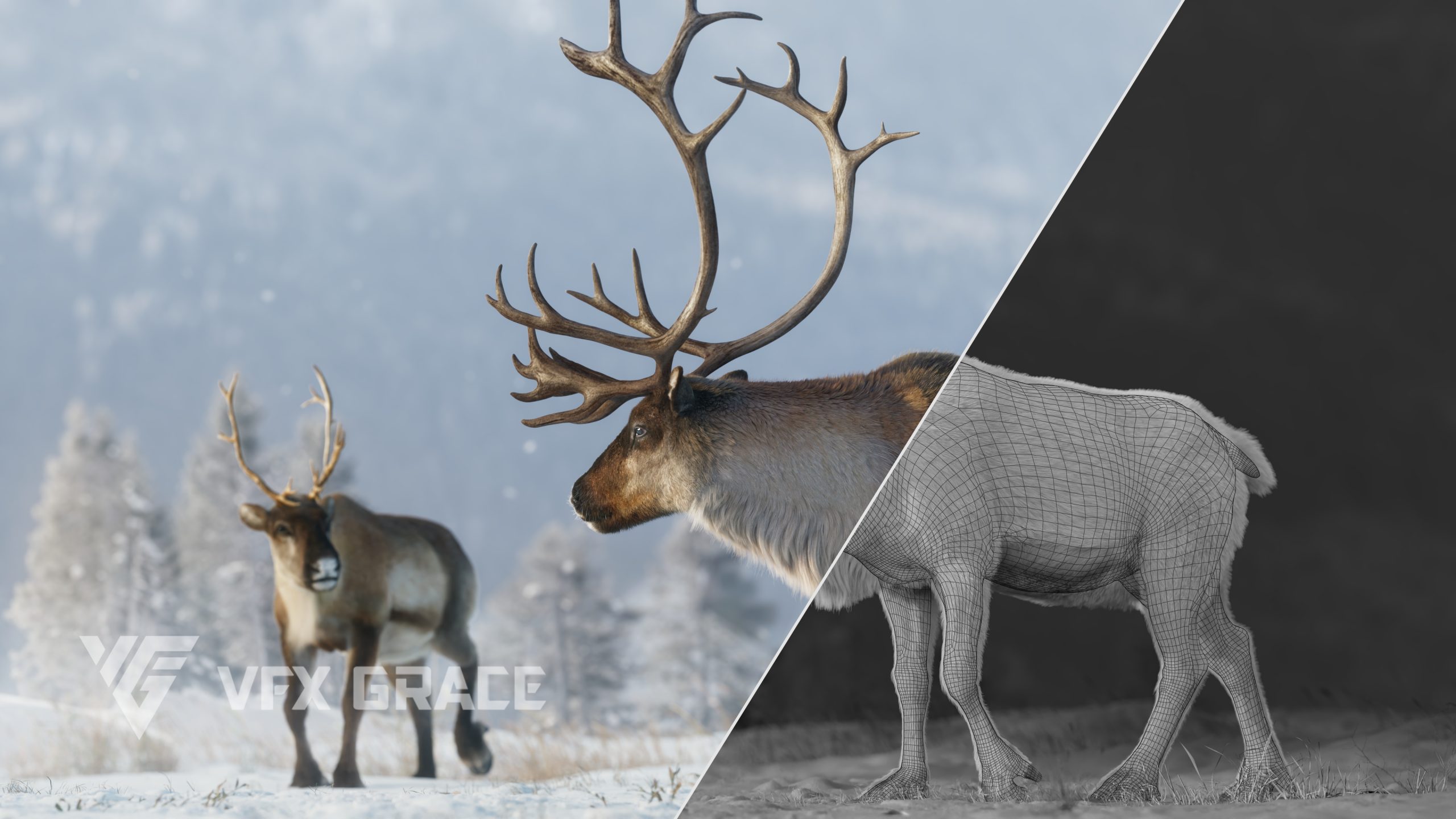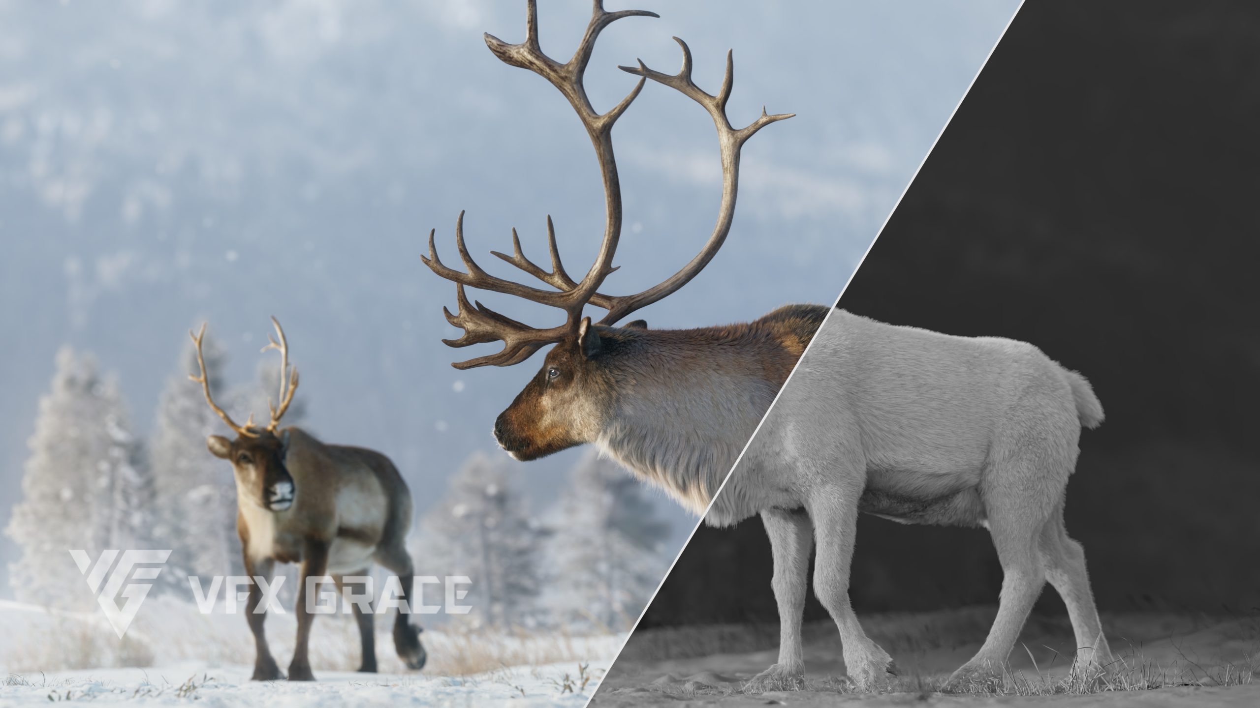 These are high-quality reindeer models with multiple 4K maps, rigging, animation, fur, and sculpting in part. And they are made by Blender and Cycles renderer at real-world scale. The body maps and fur maps are made separately, which can make the characters more realistic.