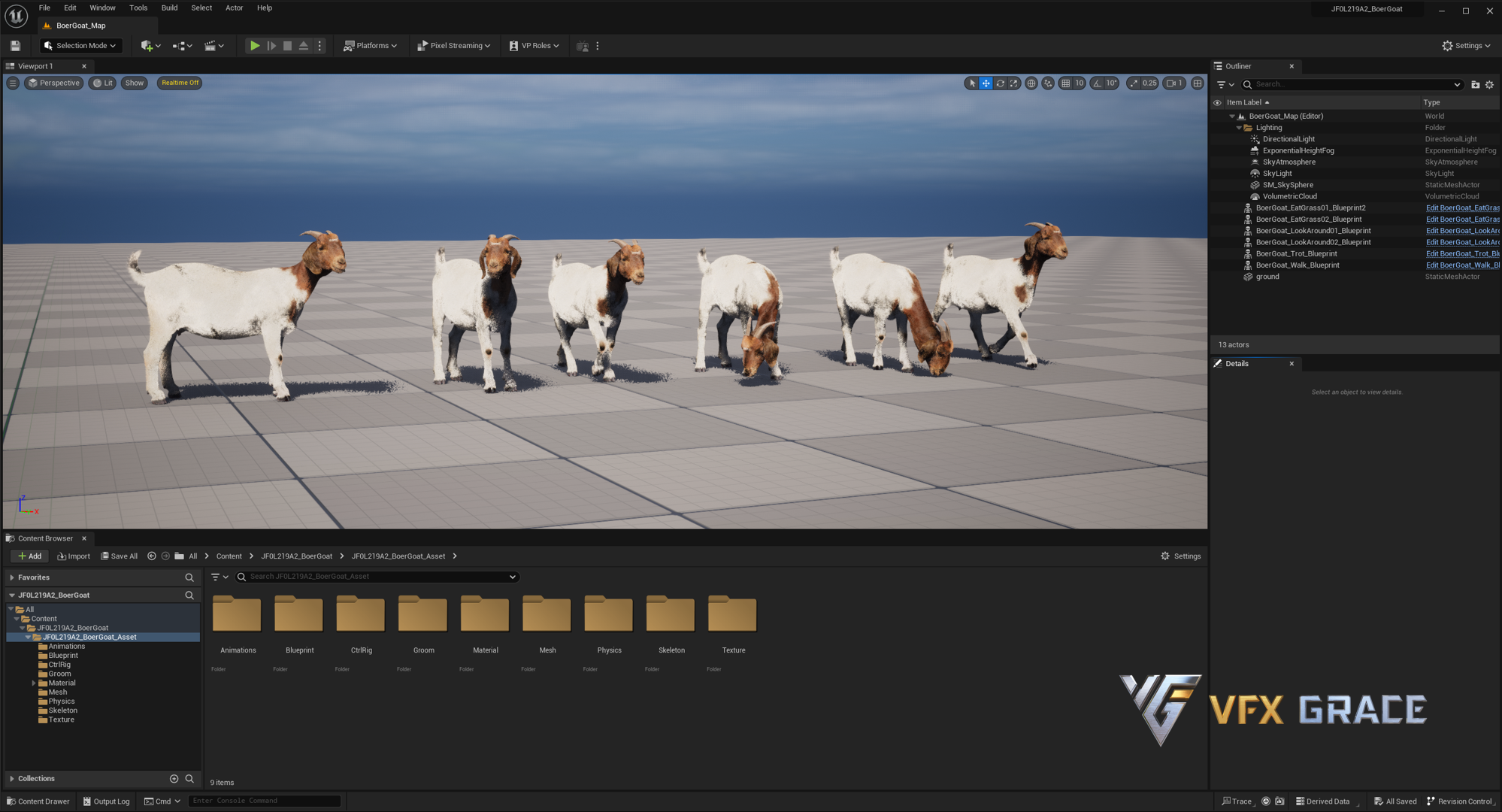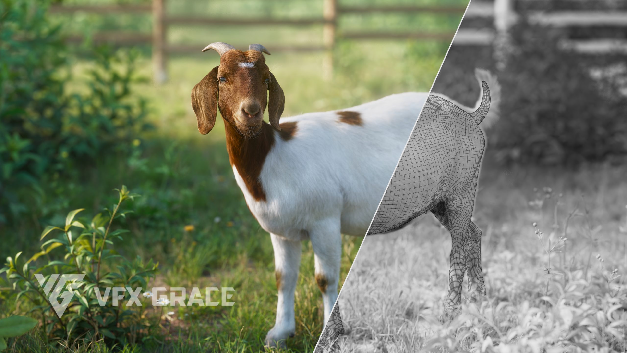 Groom Fur: A complex fur system was created in Blender, and the boer goat's fur styling has been perfectly replicated using UE's Groom technology, with finely tuned materials.