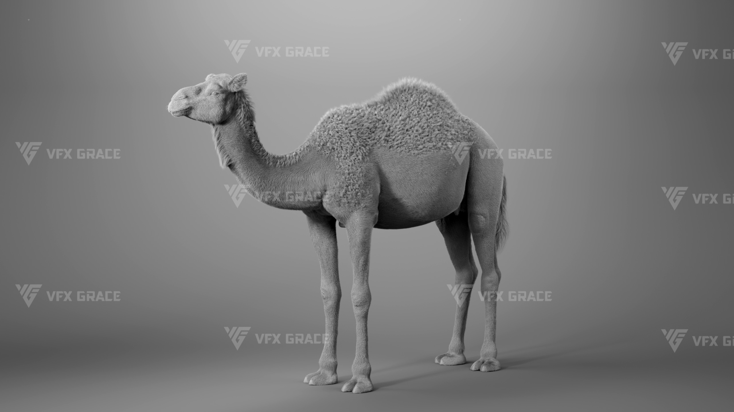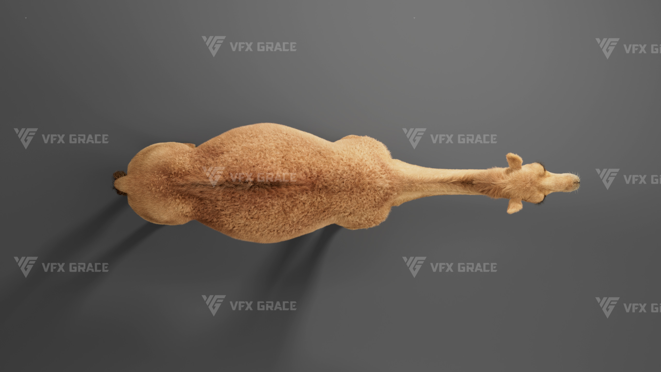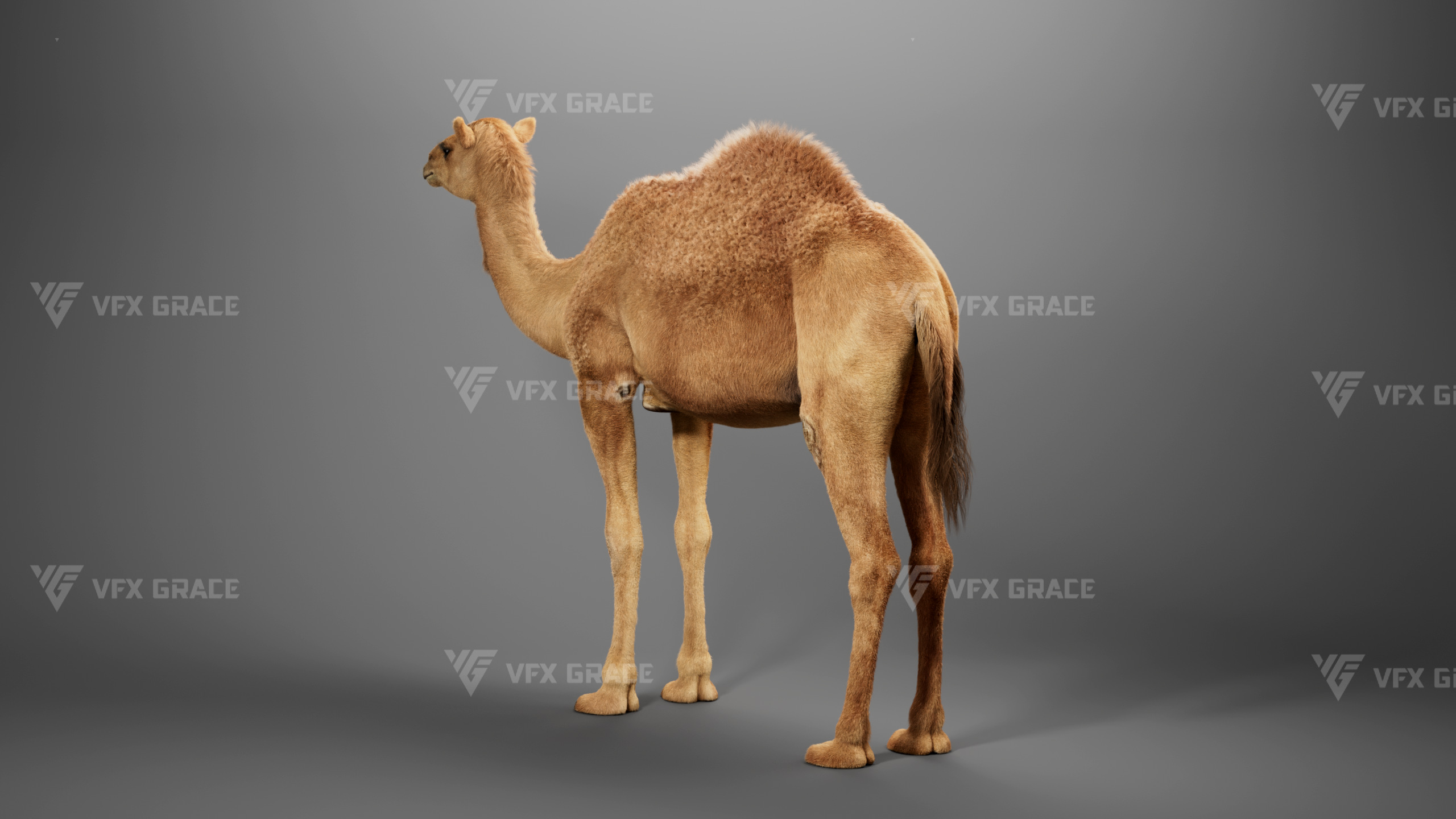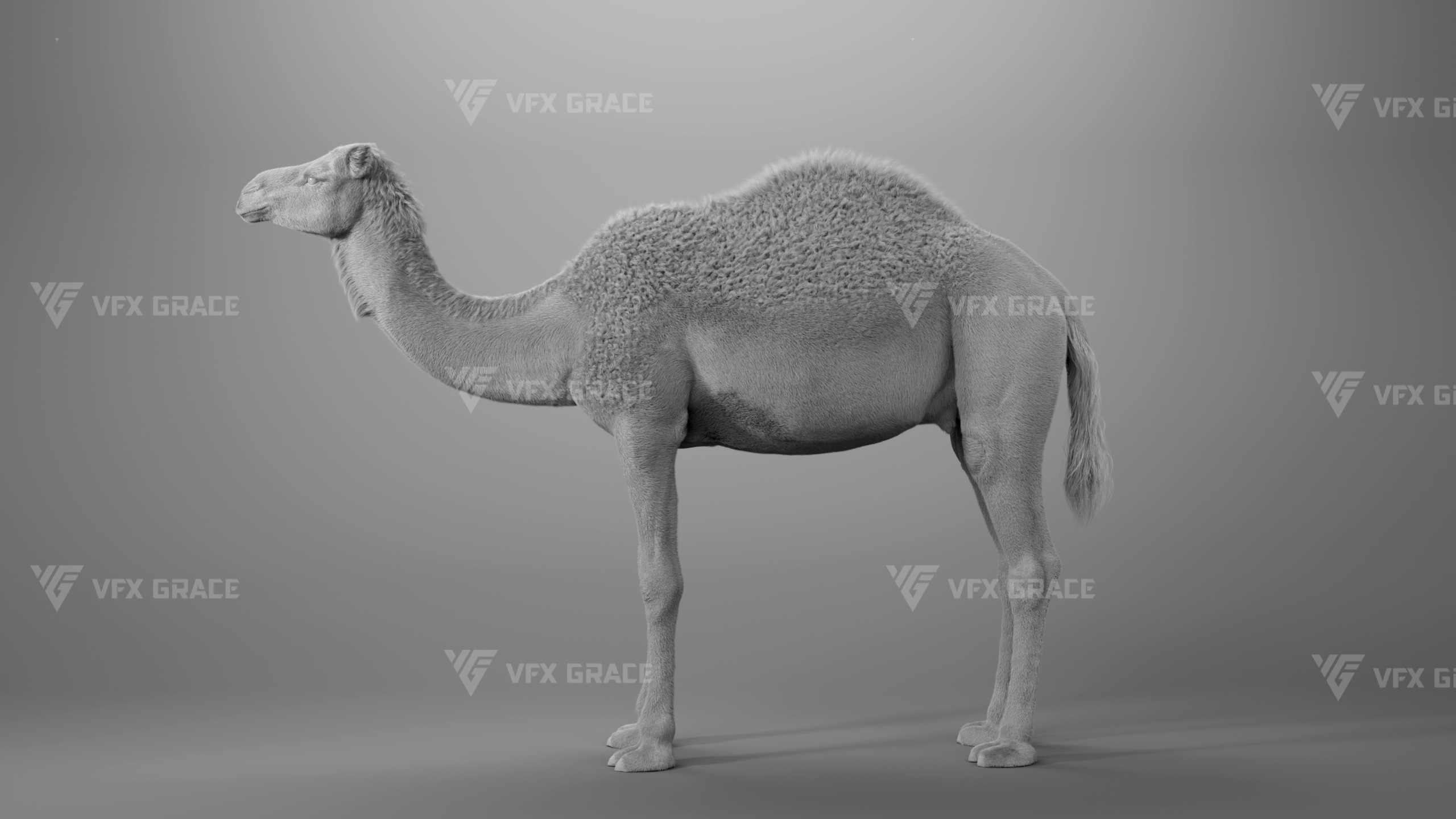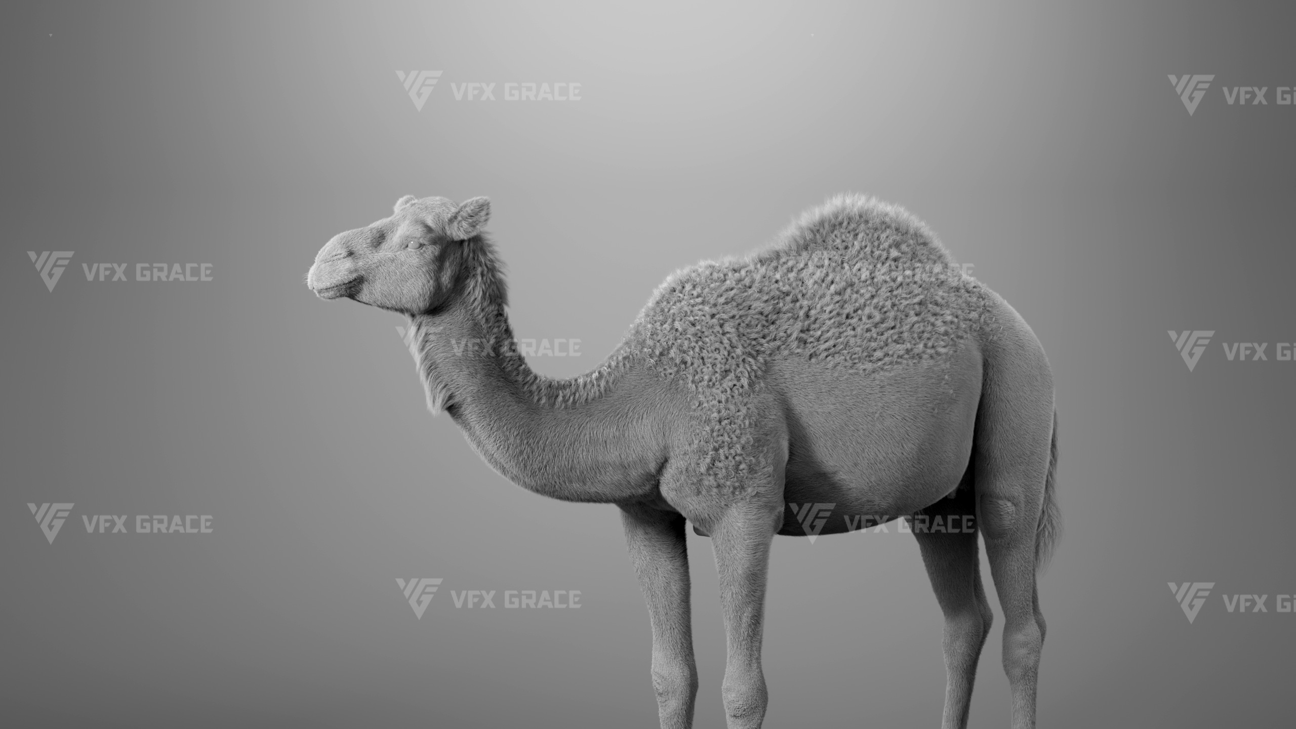 This is a high-quality dromedary camel character asset, including model, textures, hair, rigging, and animations. All hair is created using the XGen Interactive system, delivering detailed and realistic fur. The character materials are built with Arnold renderer to faithfully replicate the natural appearance and texture. The rigging is designed with reference to real skeletal proportions, ensuring animations follow natural movement principles. The project provides a complete rigging setup along with three sets of realistic animations. This character was created at real-world scale using Maya 2024, suitable for film, animation, and high-precision character presentation.