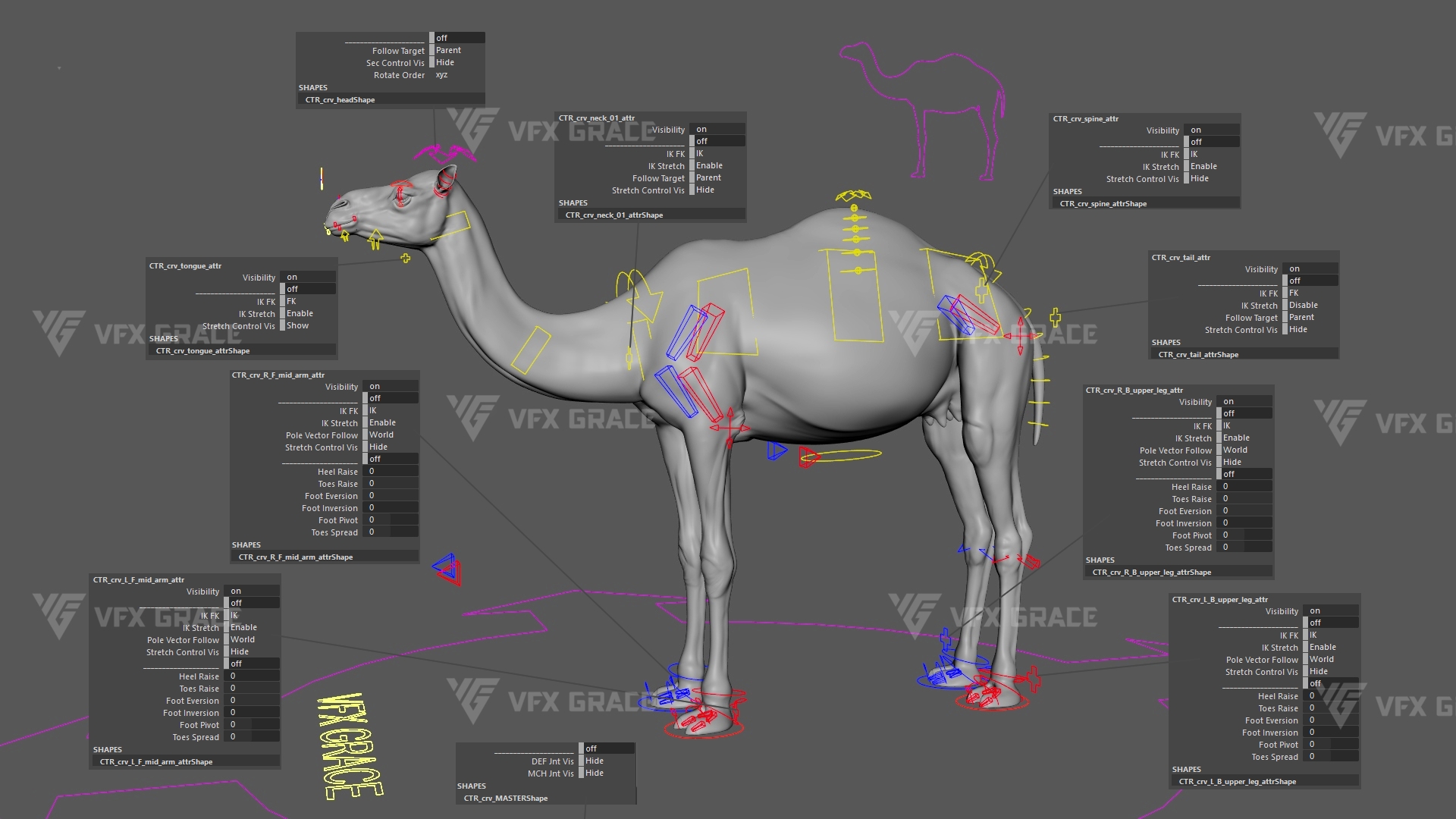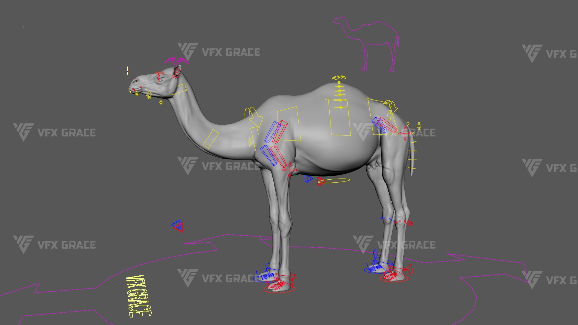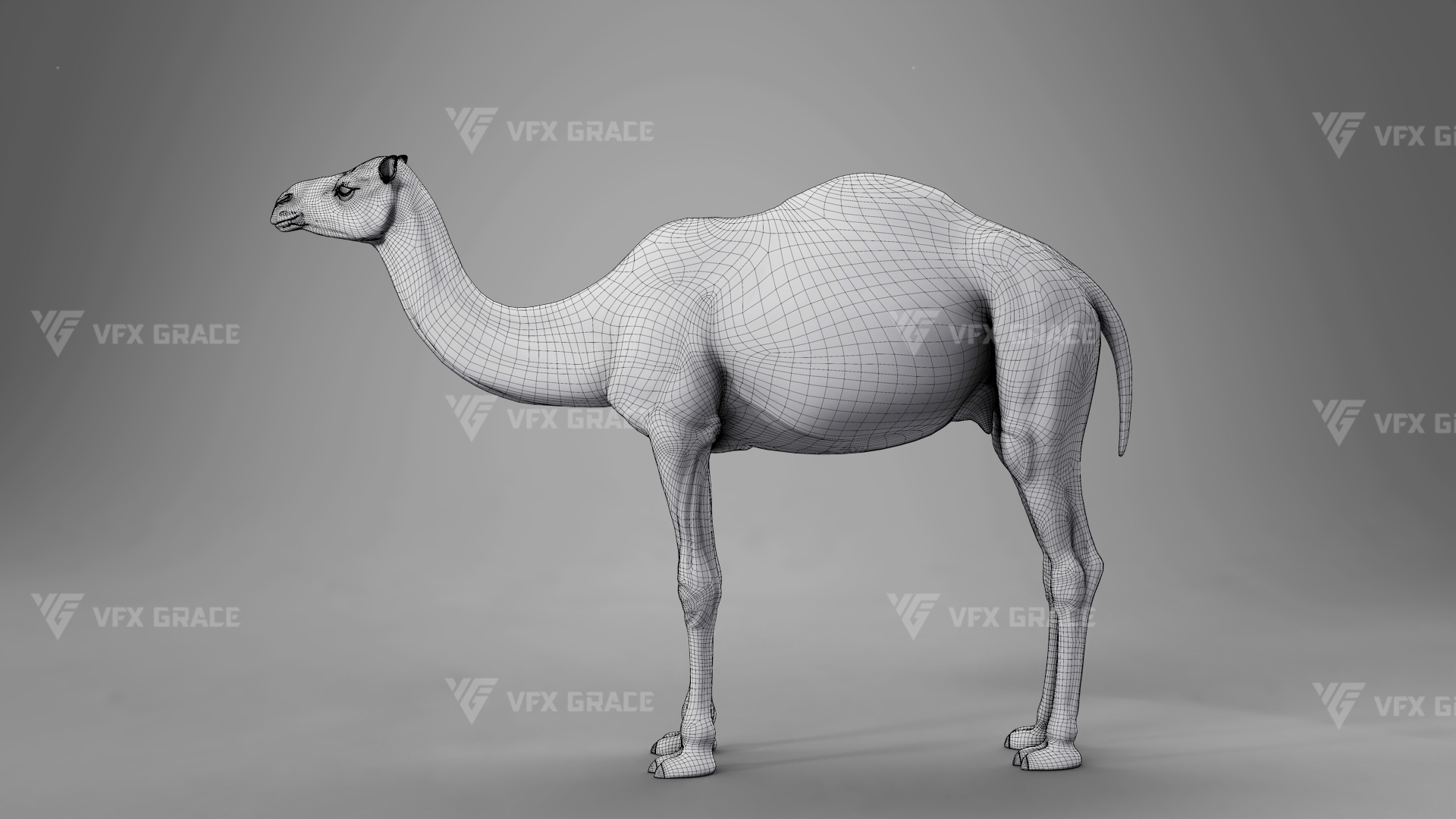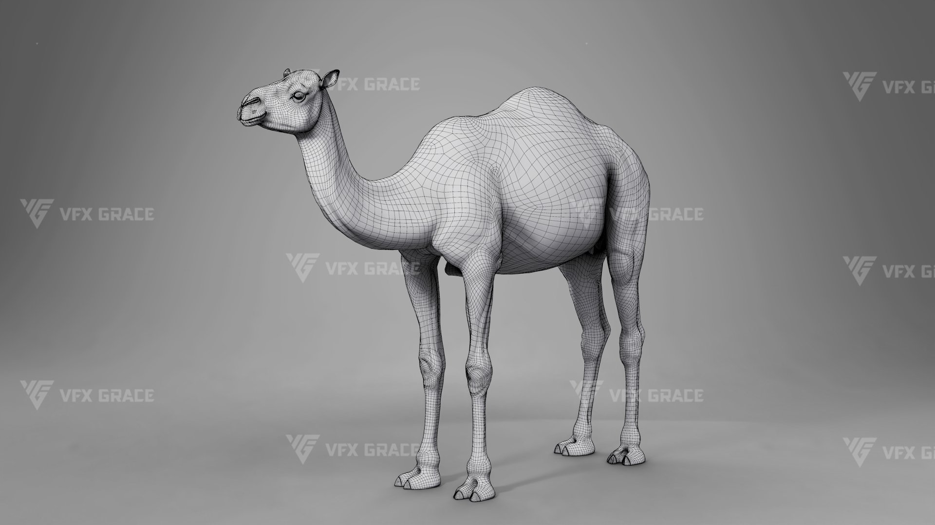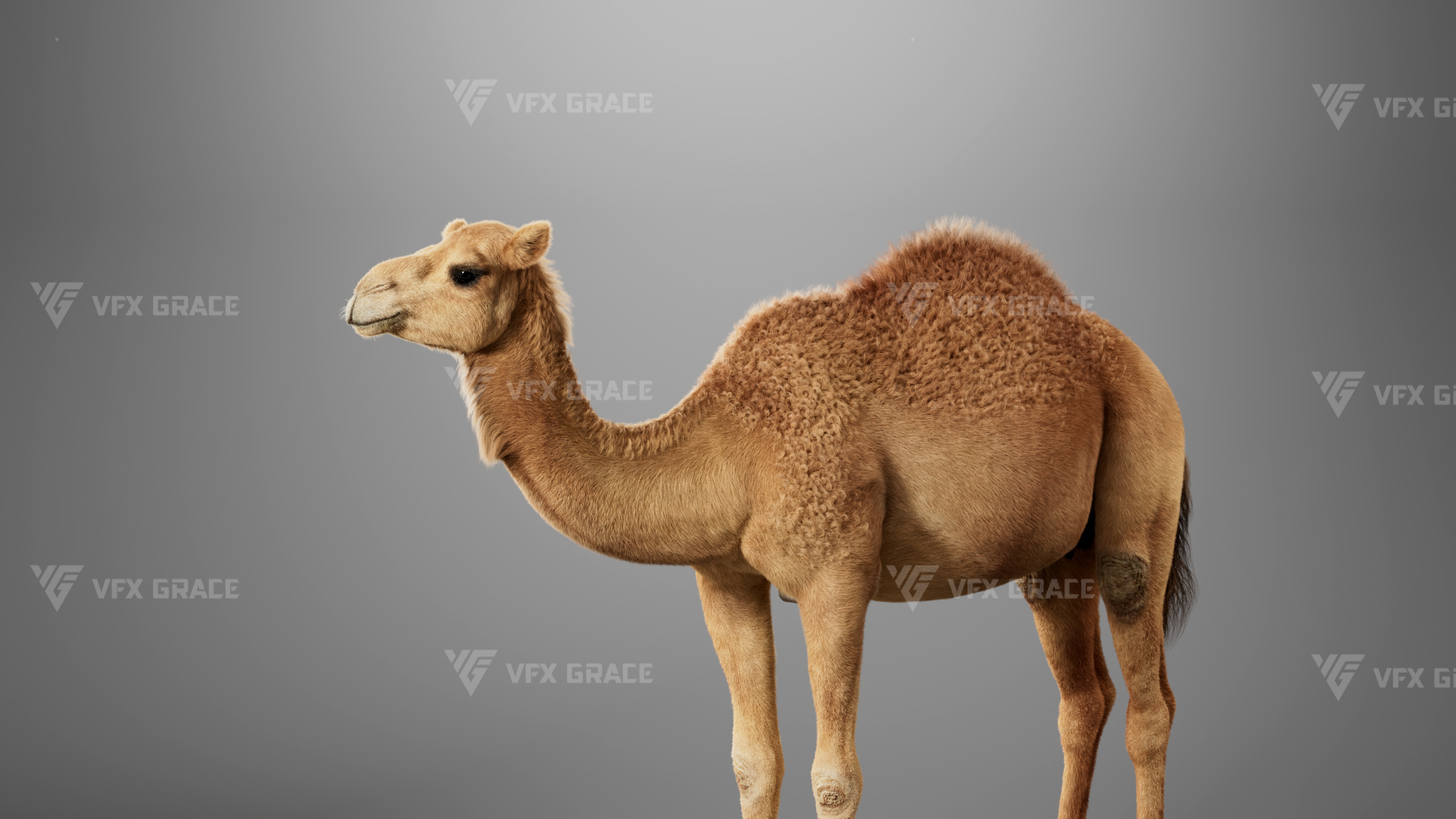 This is a high-quality dromedary camel character asset, including model, textures, hair, rigging, and animations. All hair is created using the XGen Interactive system, delivering detailed and realistic fur. The character materials are built with Arnold renderer to faithfully replicate the natural appearance and texture. The rigging is designed with reference to real skeletal proportions, ensuring animations follow natural movement principles. The project provides a complete rigging setup along with three sets of realistic animations. This character was created at real-world scale using Maya 2024, suitable for film, animation, and high-precision character presentation.