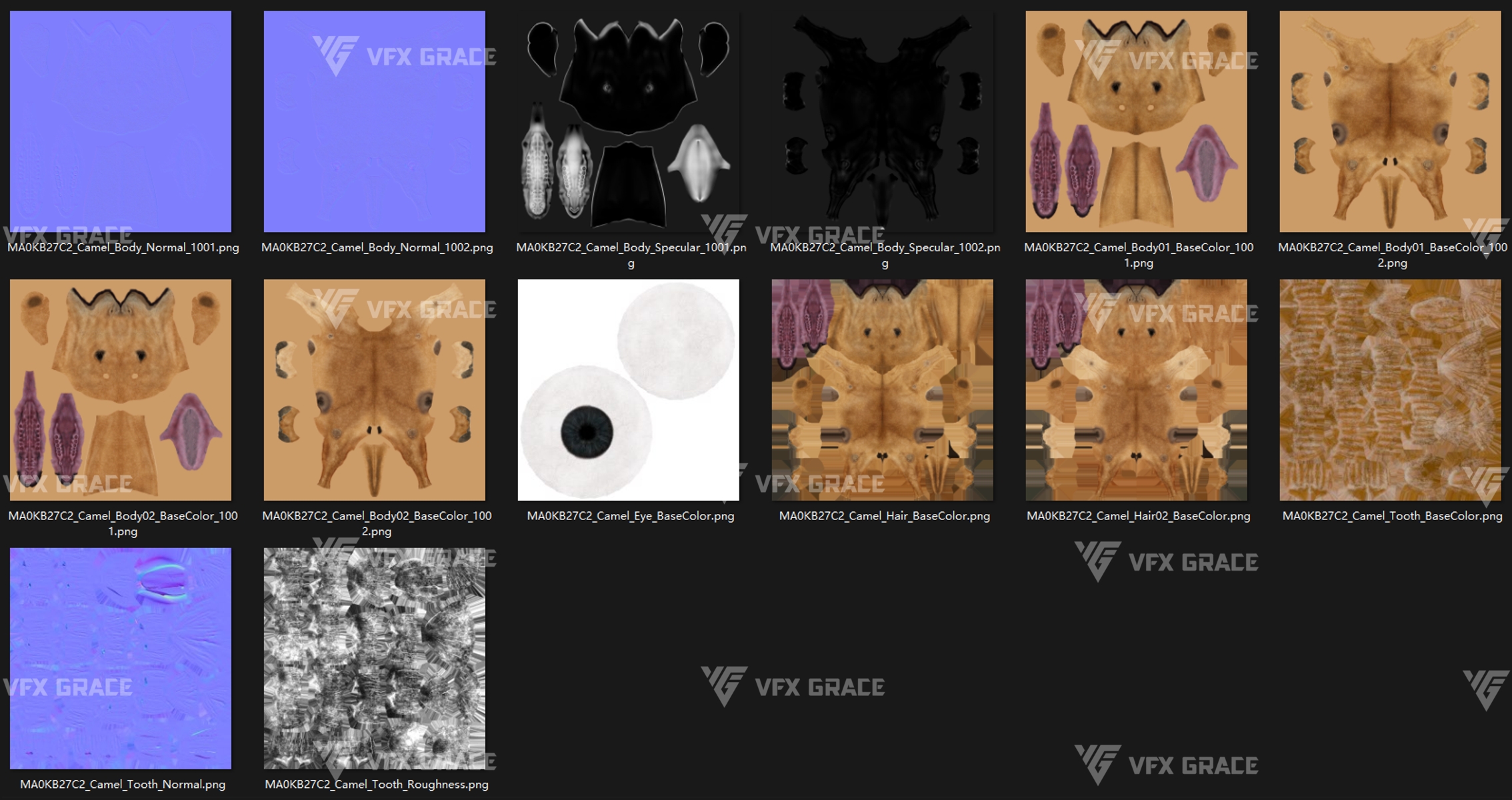 The camel body includes two different texture sets, named "Camel_Body01" and "Camel_Body02". By default, the project uses the "Camel_Body01" textures. To use "Camel_Body02", you can manually switch the textures from the textures folder.