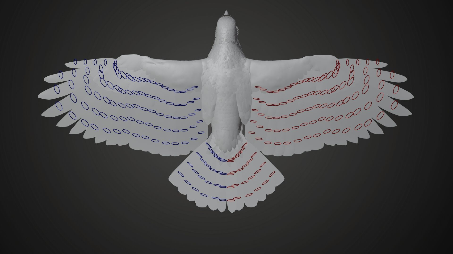 Each feather has skinned bones, an FK controller, a bending controller. Besides, there are some controllers which are to bend, rotate, fold multiple feathers overall.