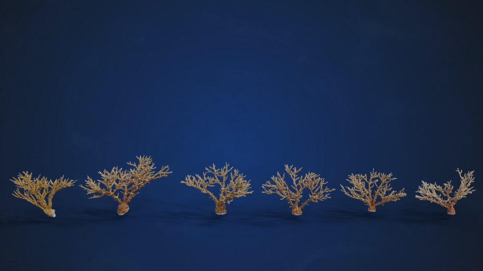 This is a set of varying types of corals: dendronephthya, table coral, staghorn coral, montipora foliosa, heliopora coerulea, crinoidea and sea anemones. And some of them have multiple shapes, even up to 42, which greatly enhance the realism of your scenes. The model is made with Blender and Cycles renderer.