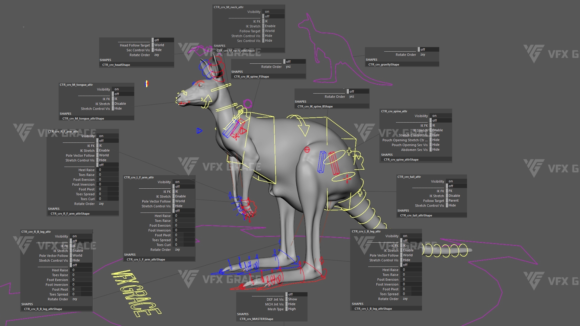 CTR_crv_MASTER – Main character controller, with custom attributes: