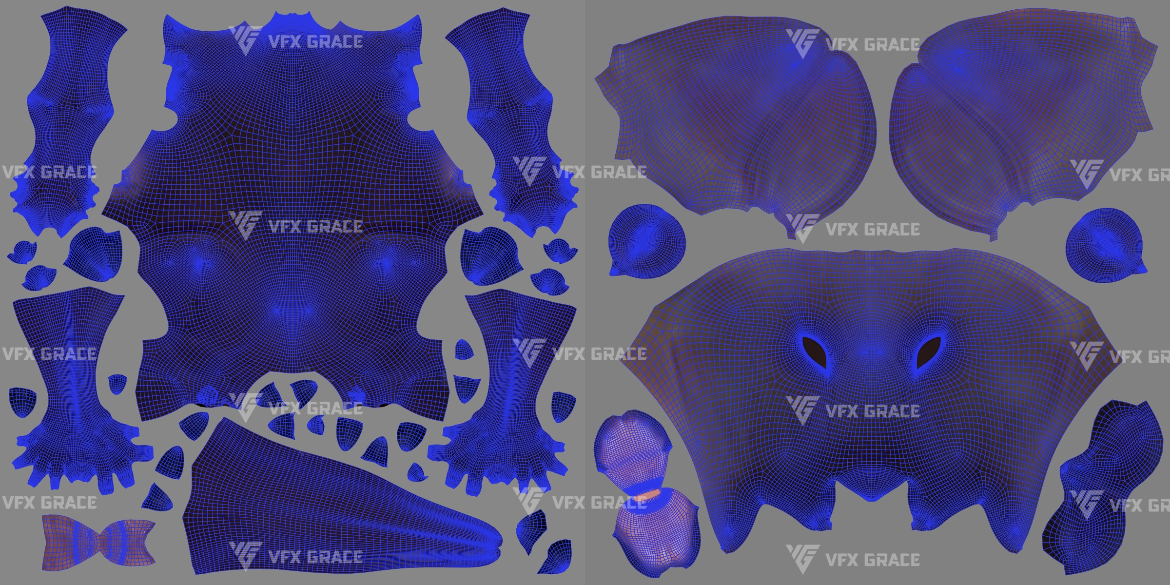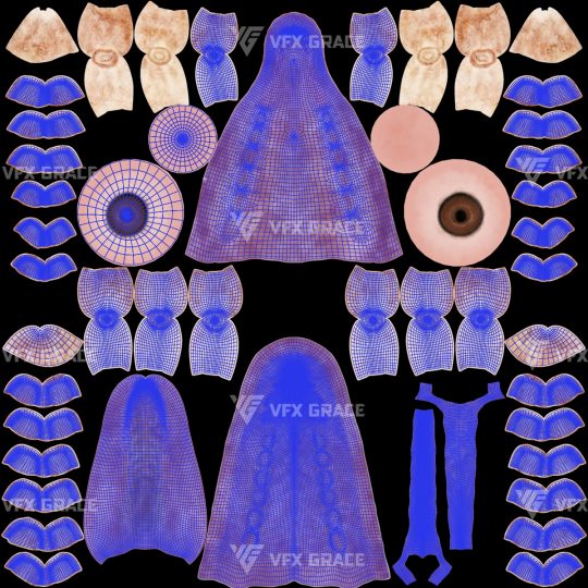 XGen hair: XGen interactive is used for presenting the details of the hair faster, and all maps of density and modifier masks for hair layering are included externally, all masks are in 1K resolution.