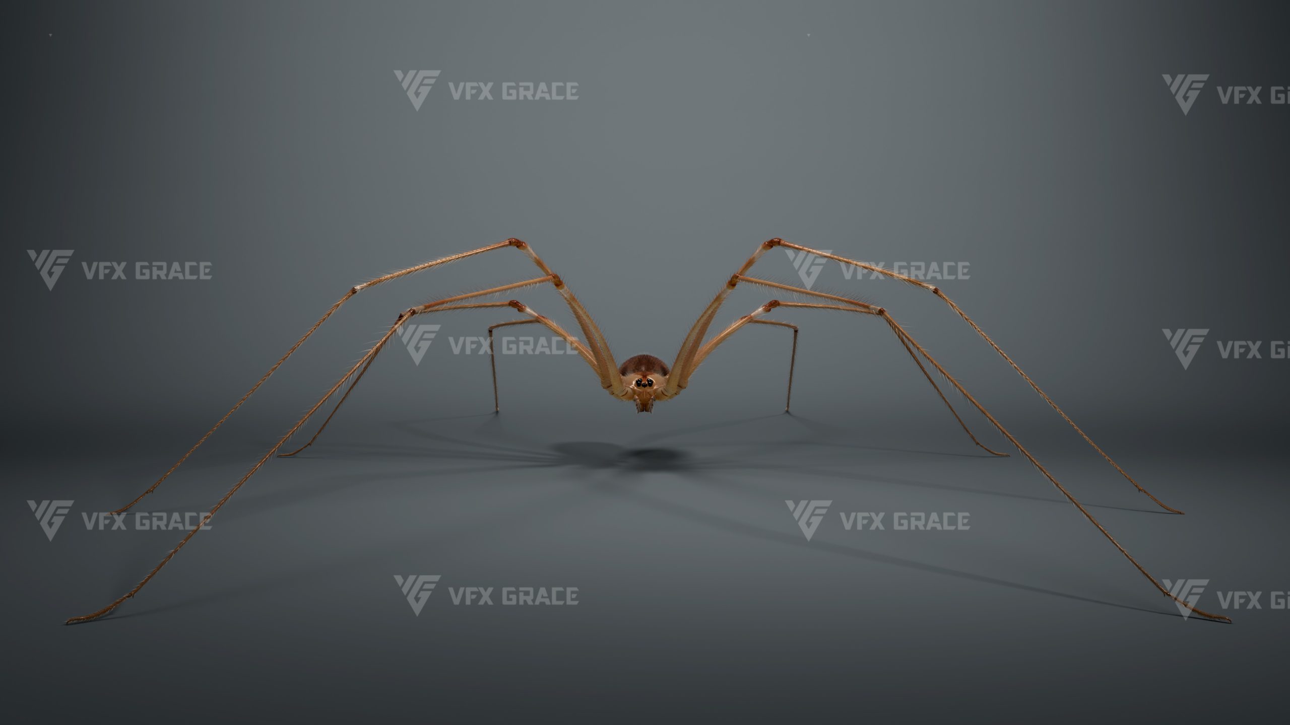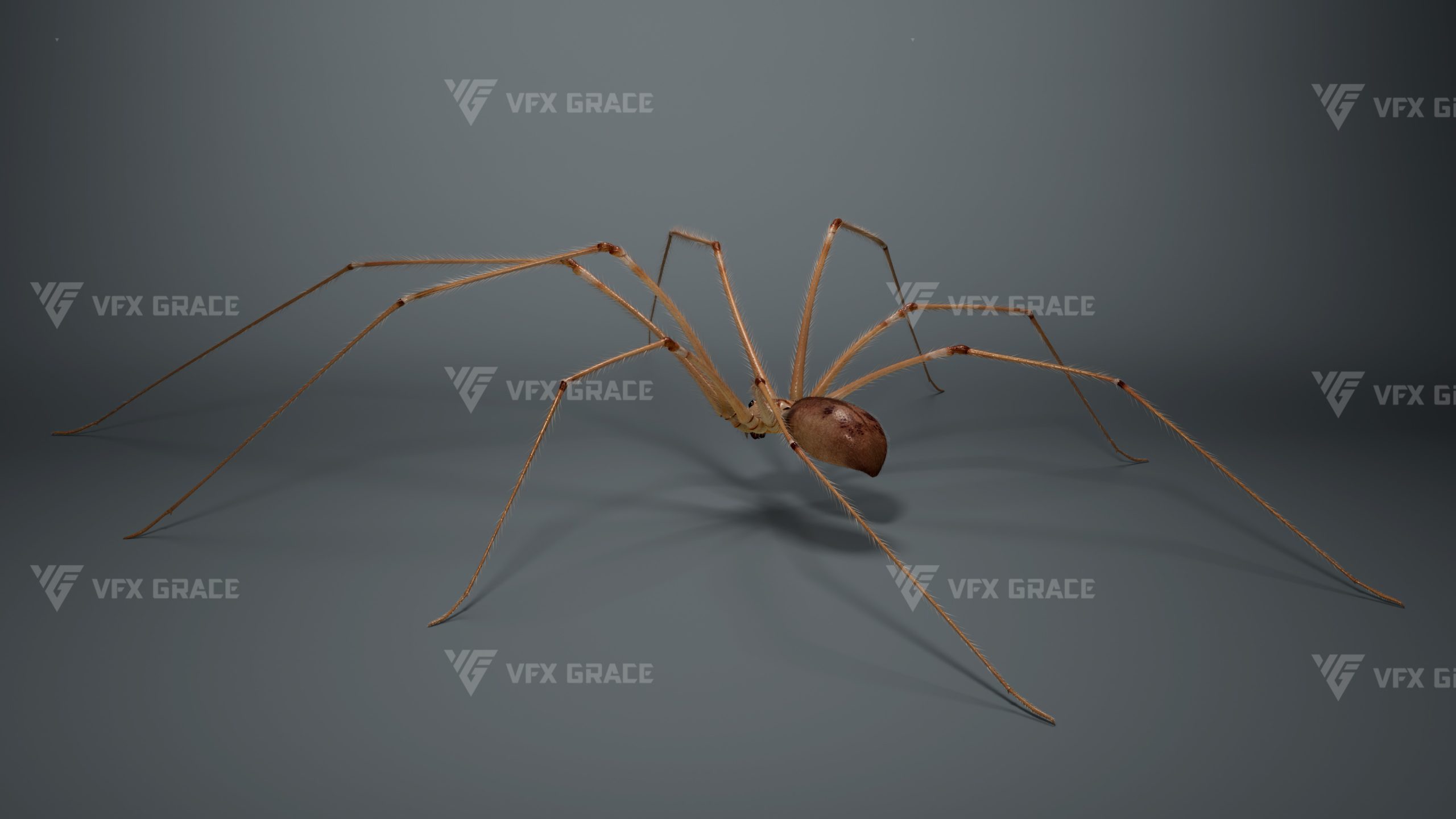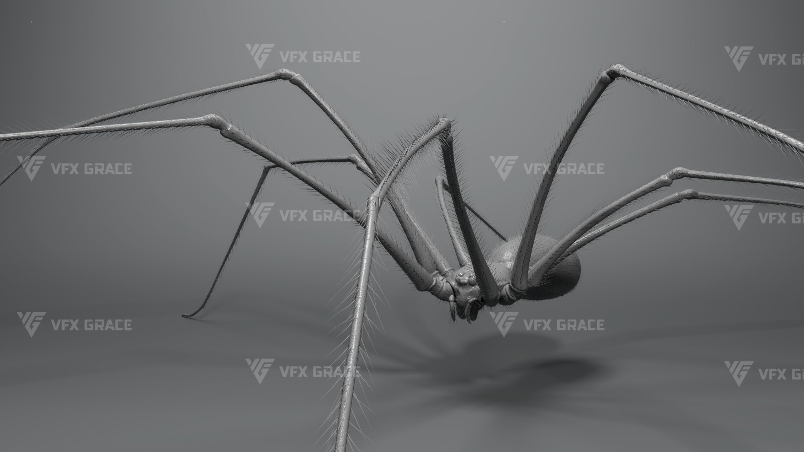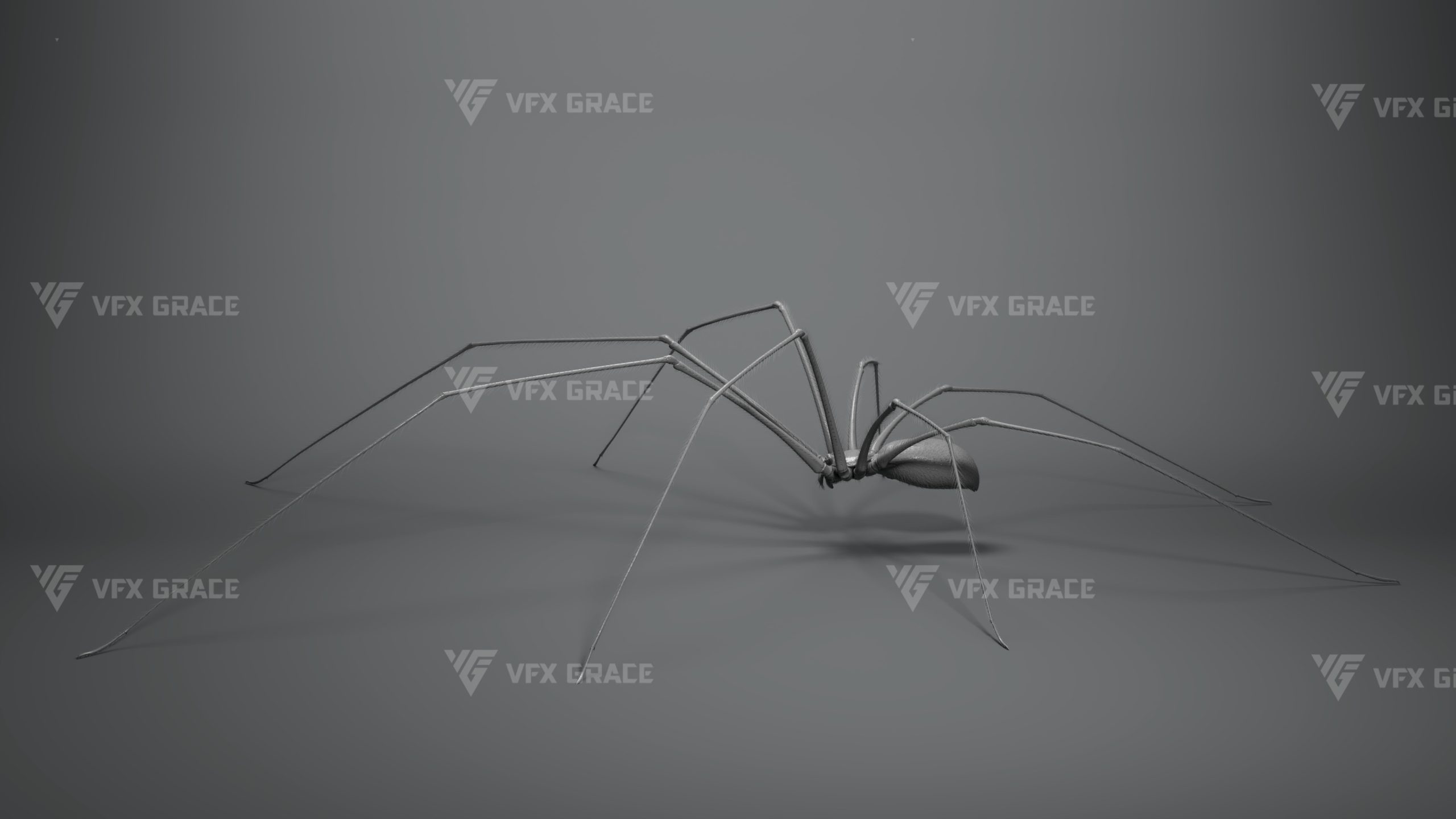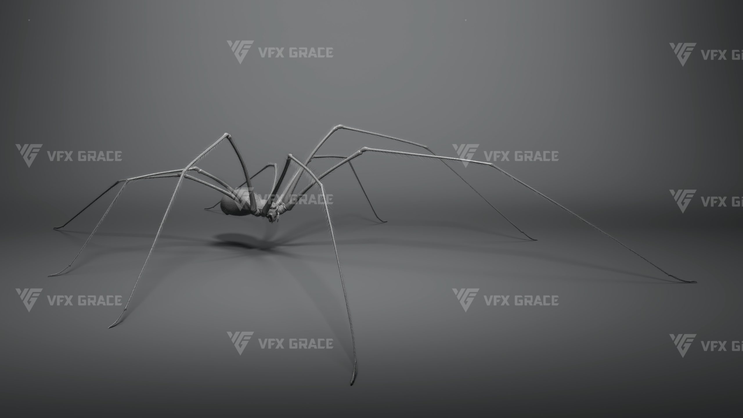 This is a high-quality ghost spider model with textures, hair, rigging and animation. The hair is created in XGen Interactive with enough details, and all textures are rendered with Arnold renderer for realistic effects. The scene includes a rigged project and one standard animation. This character was created using the latest version of Maya 2026, and the model is built to real-world scale.