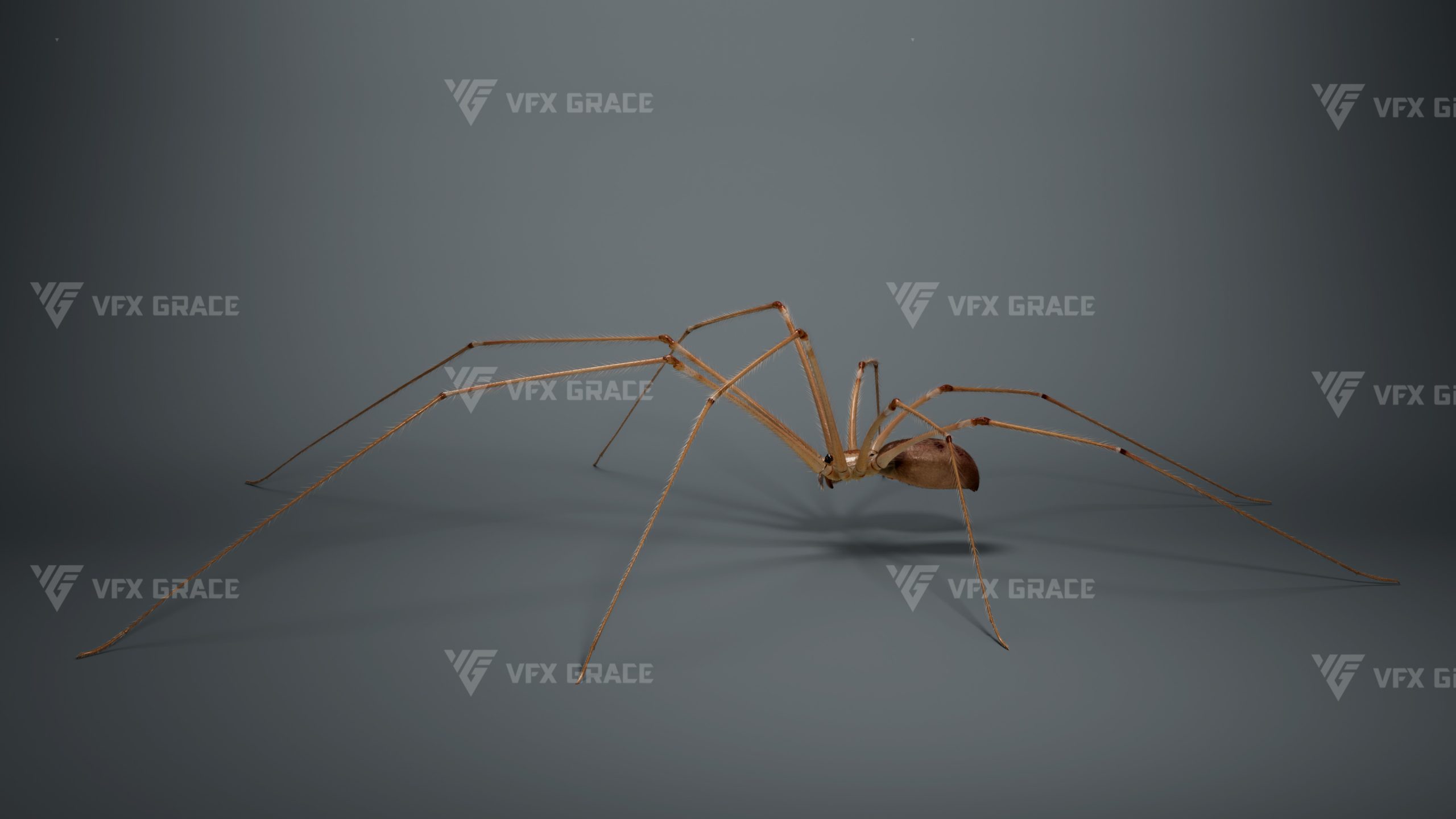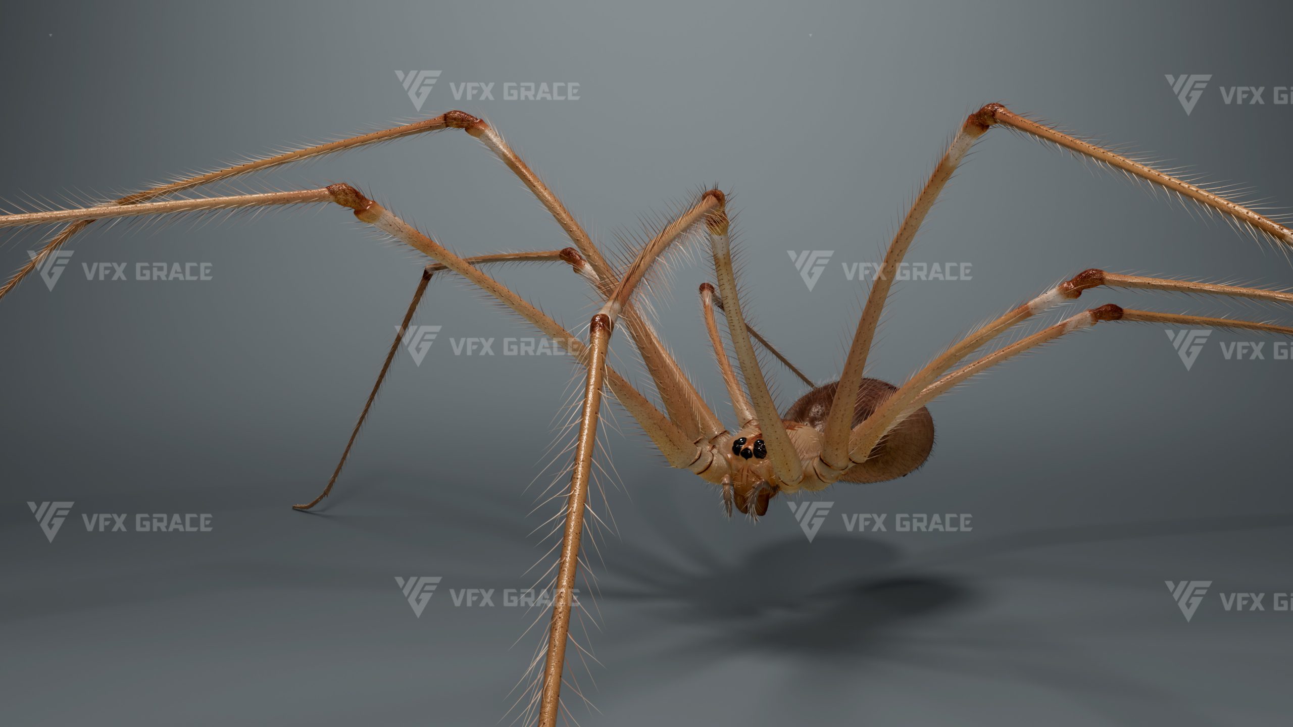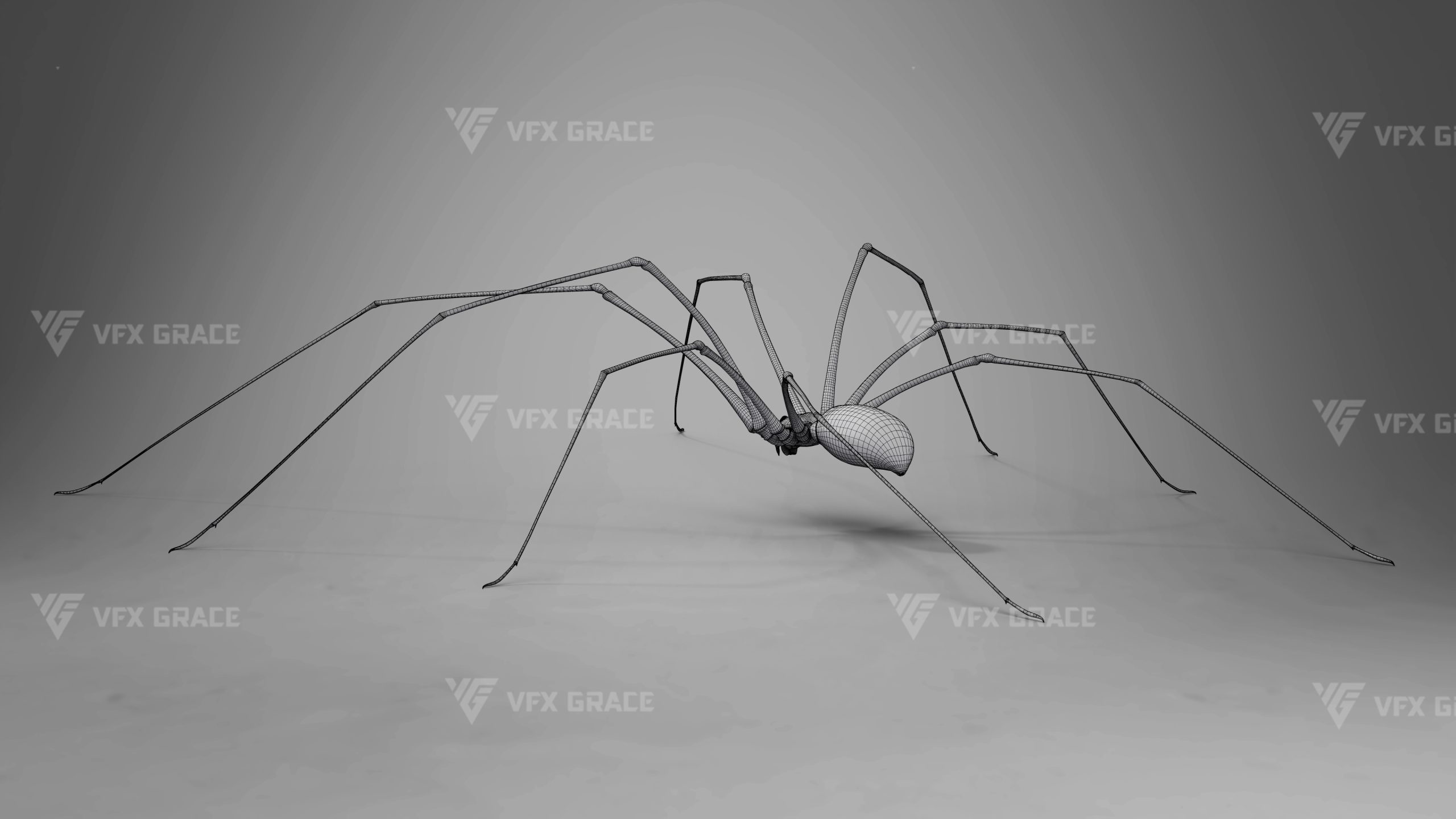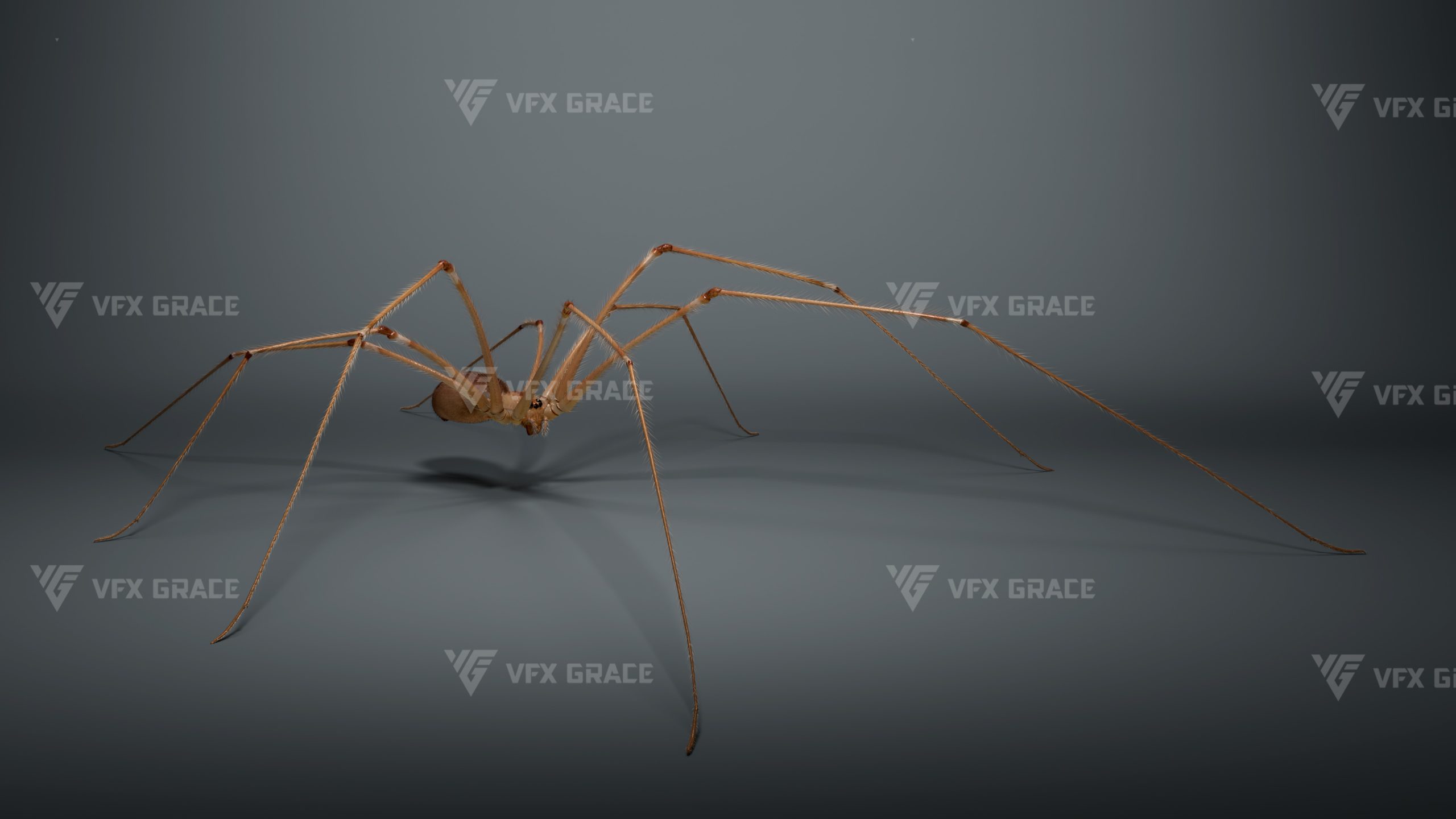 This is a high-quality ghost spider model with textures, hair, rigging and animation. The hair is created in XGen Interactive with enough details, and all textures are rendered with Arnold renderer for realistic effects. The scene includes a rigged project and one standard animation. This character was created using the latest version of Maya 2026, and the model is built to real-world scale.