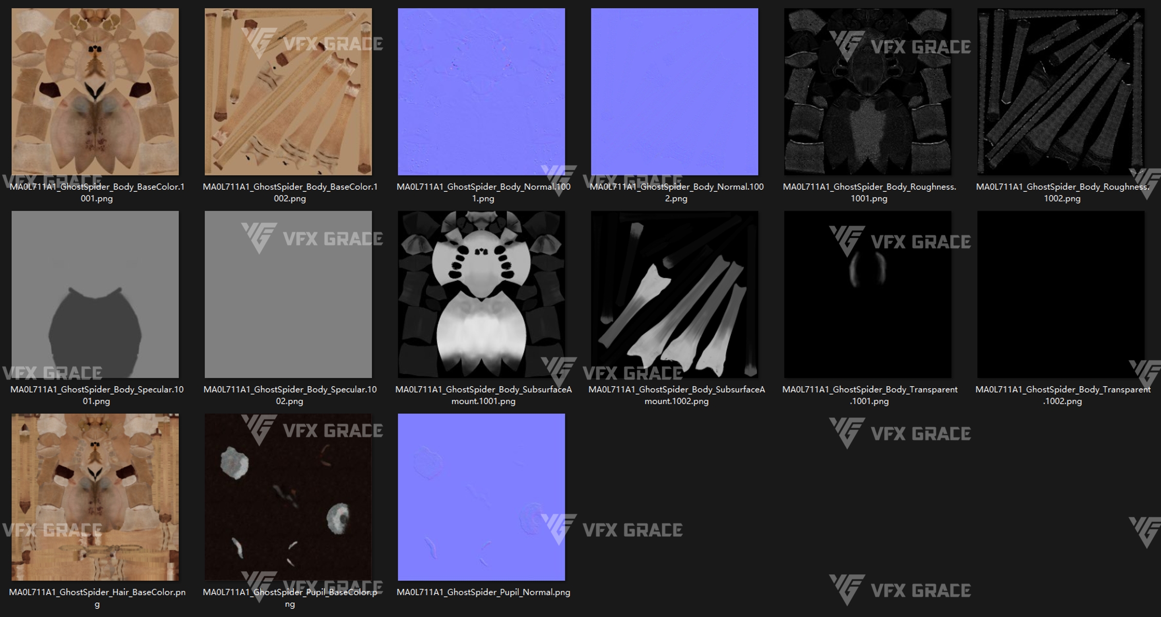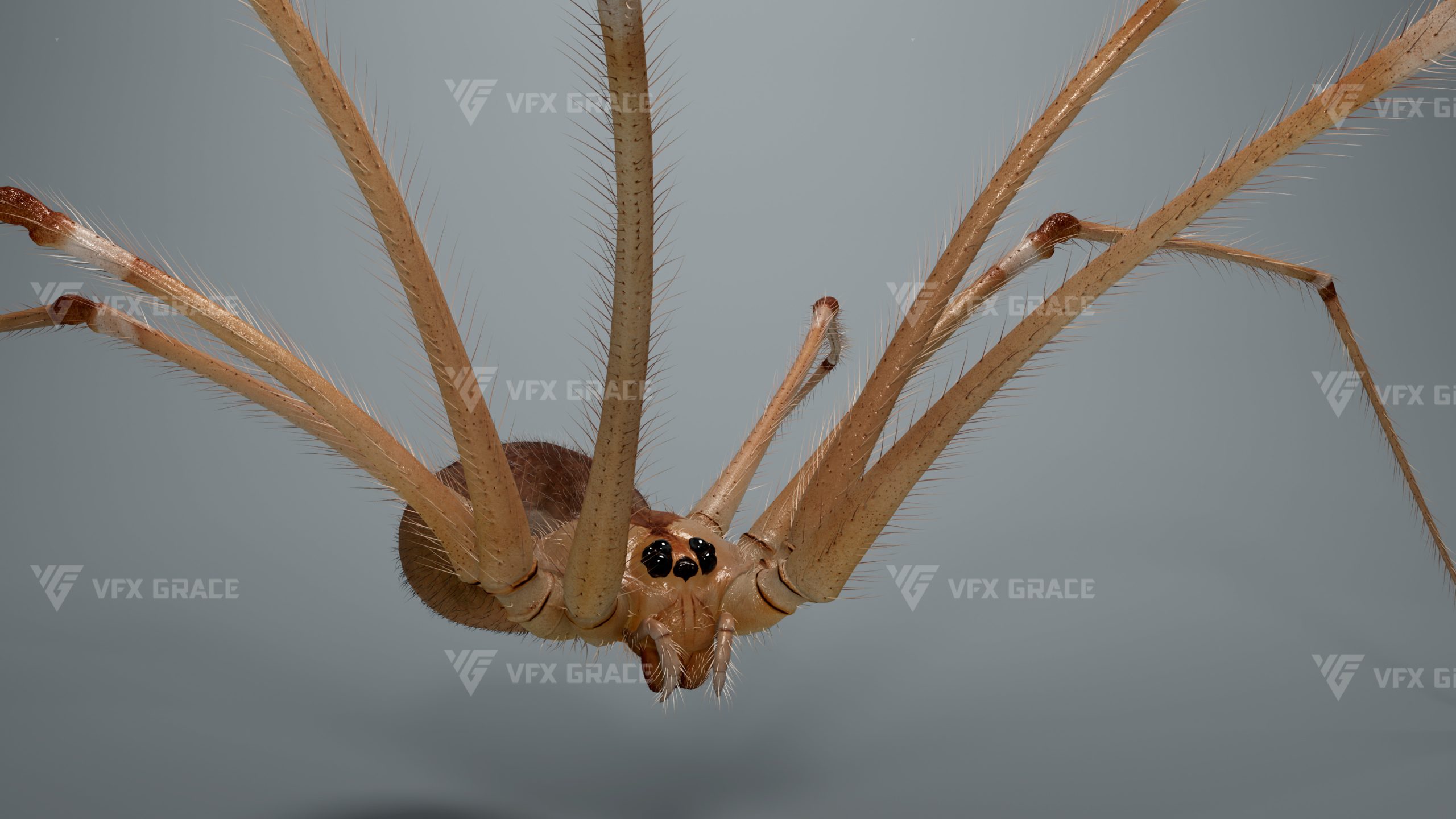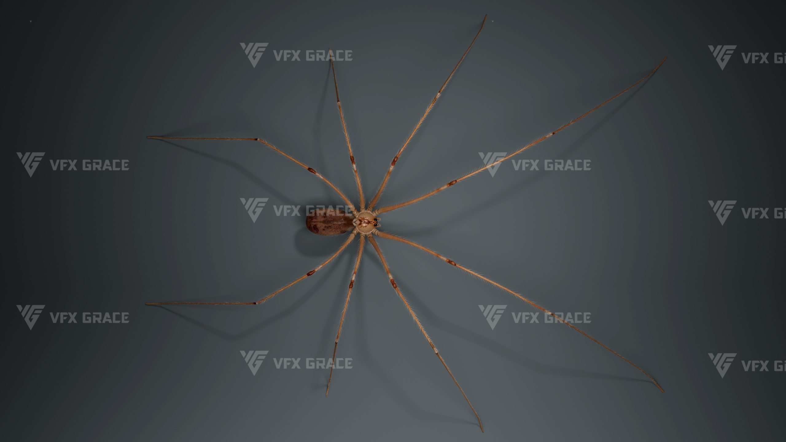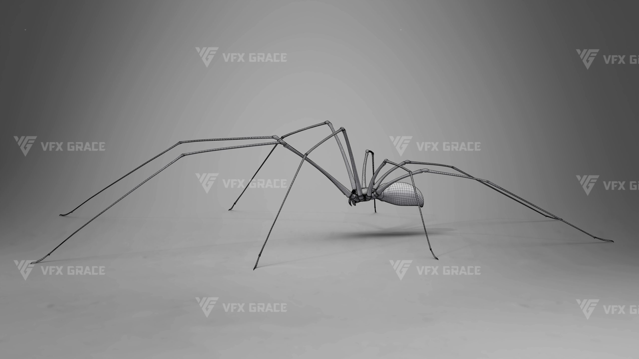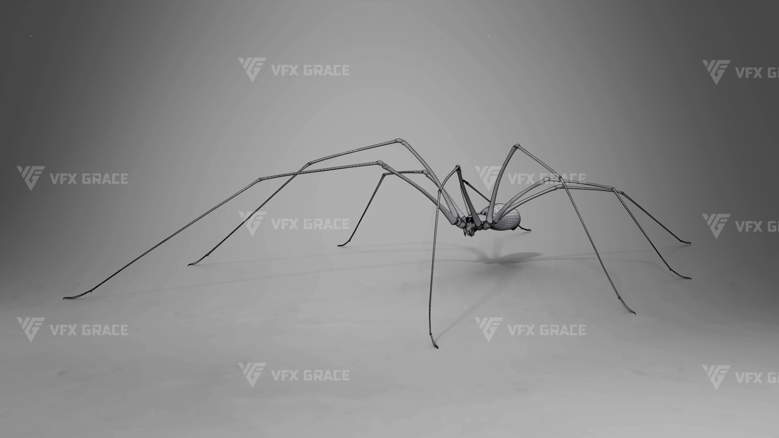 This is a high-quality ghost spider model with textures, hair, rigging and animation. The hair is created in XGen Interactive with enough details, and all textures are rendered with Arnold renderer for realistic effects. The scene includes a rigged project and one standard animation. This character was created using the latest version of Maya 2026, and the model is built to real-world scale.