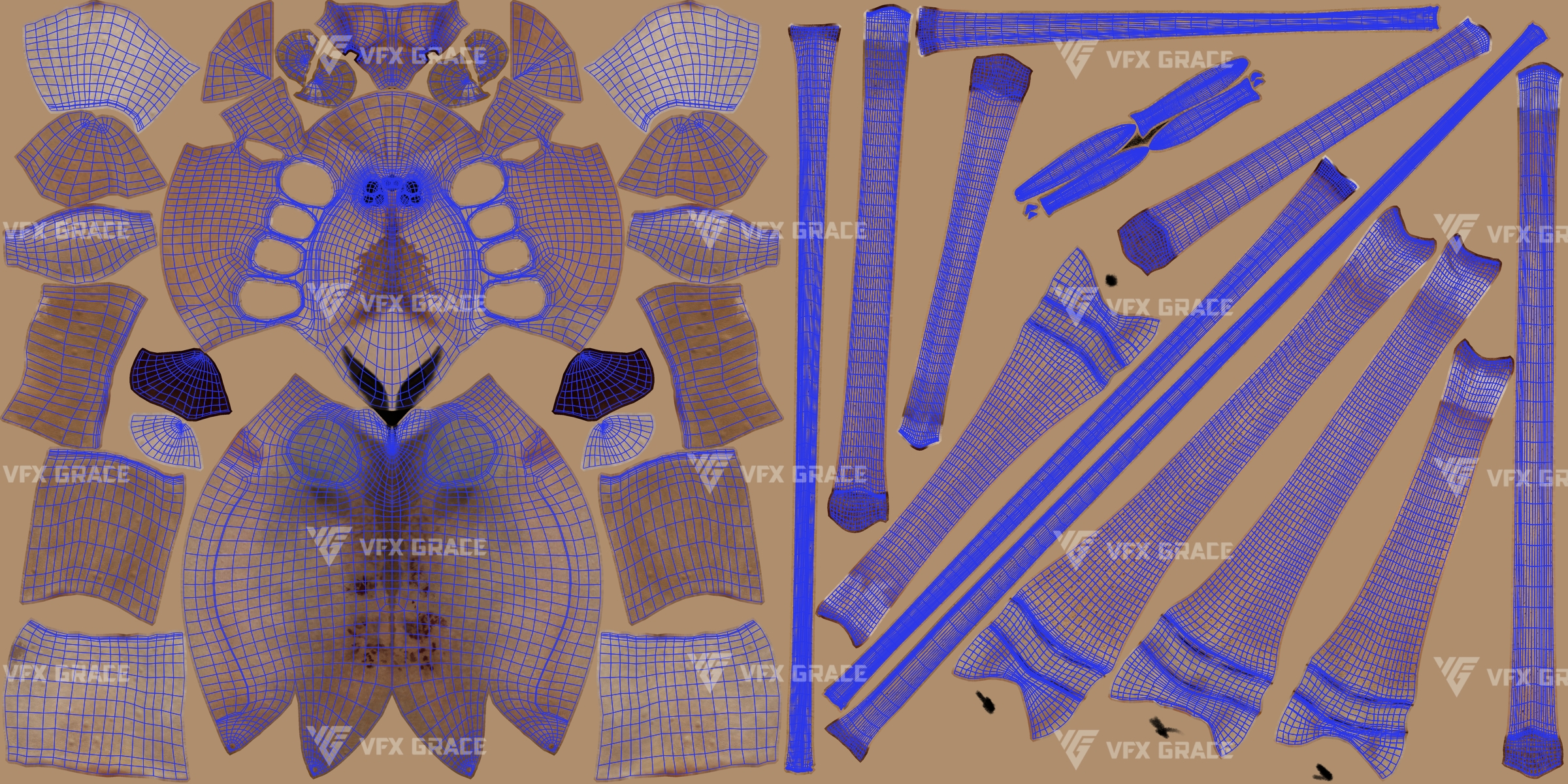 XGen hair: XGen Interactive is used for presenting the details of the hair faster, and all maps of density and modifier masks for hair layering are included externally, all masks are in 1K resolution.