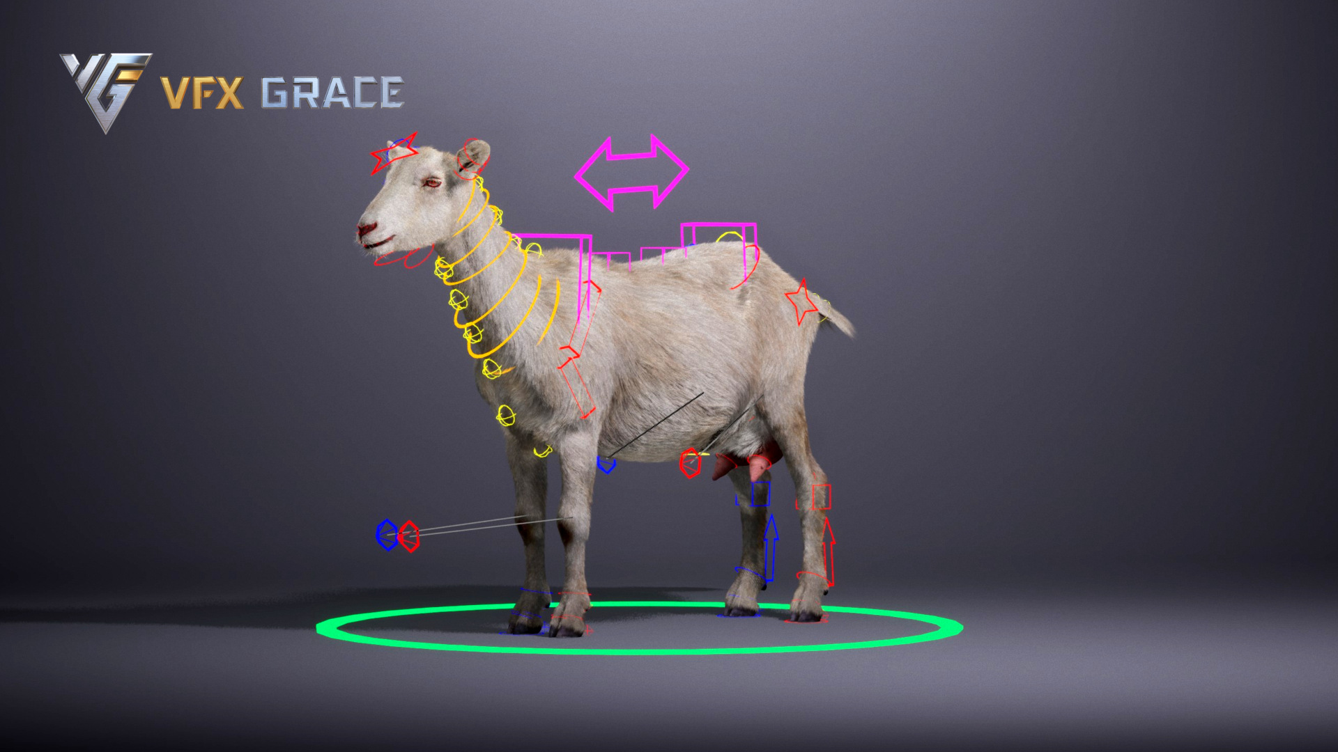 Groom Fur: A complex fur system was created in Blender, and the goat's fur styling has been perfectly replicated using UE's Groom technology, with finely tuned materials.
