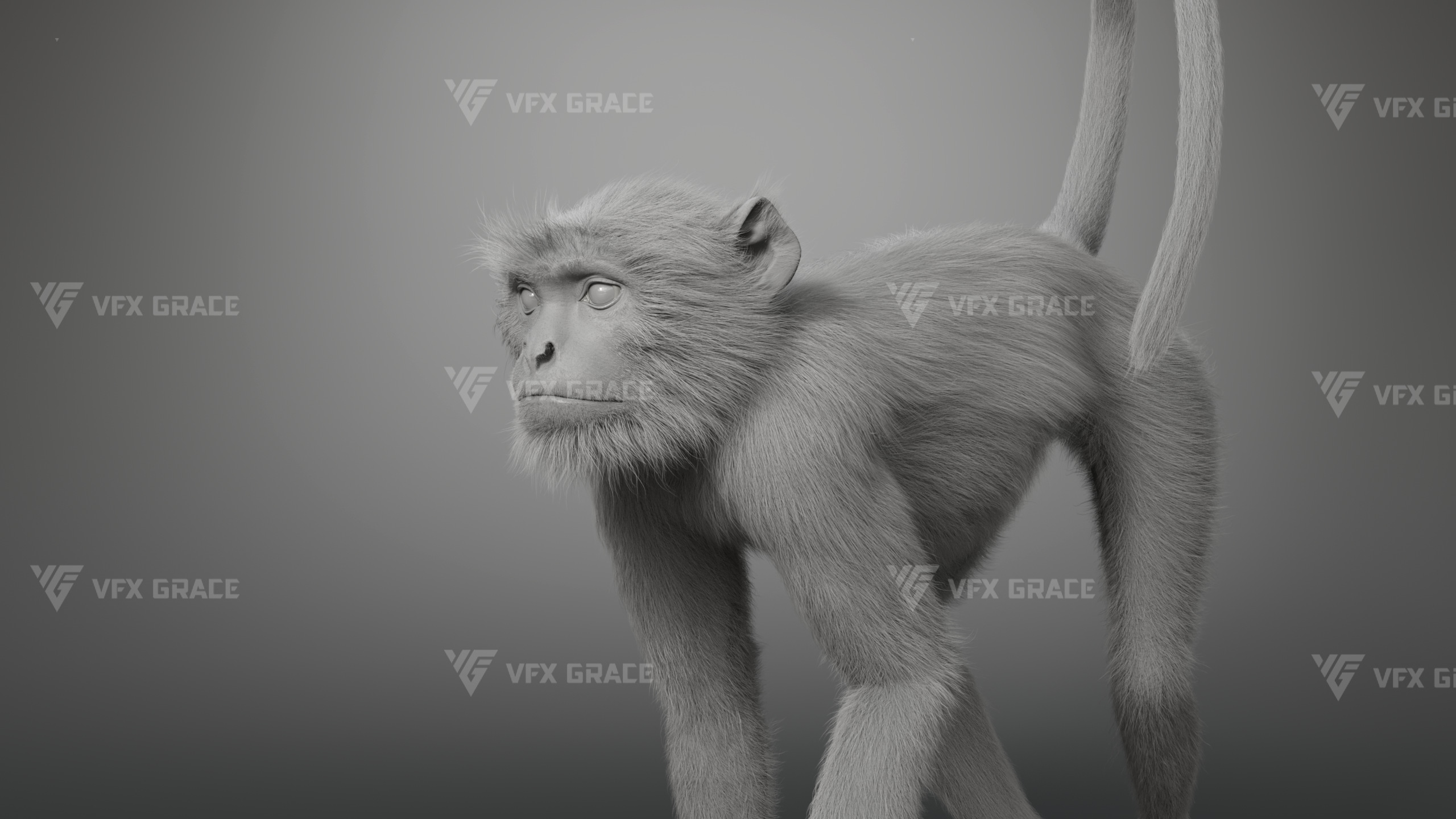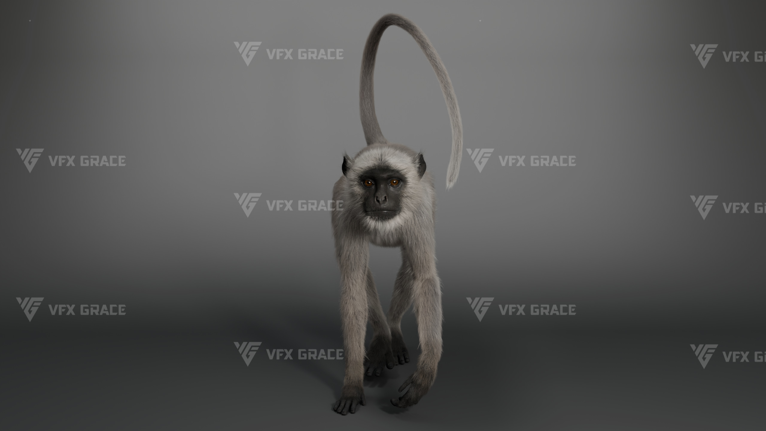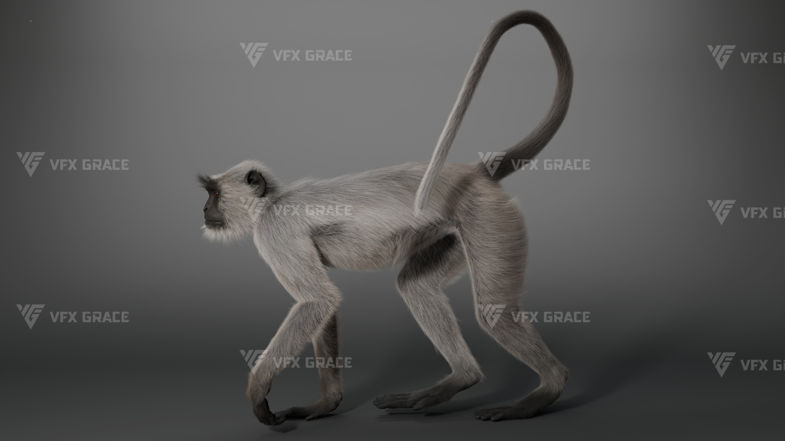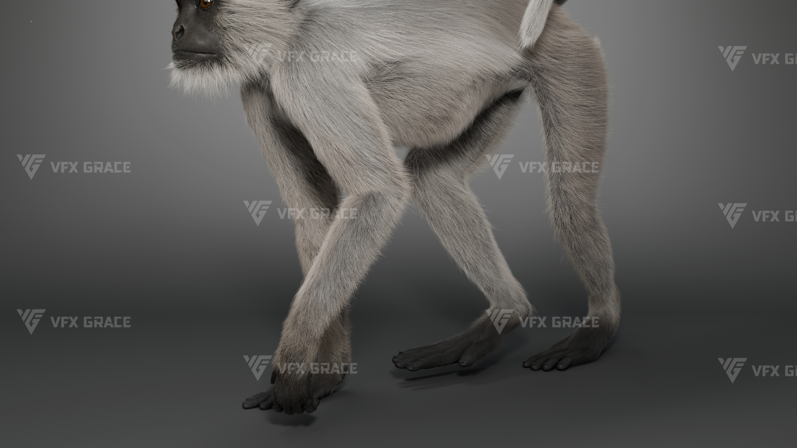 This is a high-quality Gray Langur character asset, the project includes model, textures, hair, rig, and animation, all hair is created with the XGen Interactive system, presenting fine and detailed hair effects, the character material is built on the Arnold renderer, realistically restoring the character’s appearance and texture, the rigging structure is built with reference to real skeletal proportions, making the animation motion more in line with natural movement, the scene provides a complete rigged project and 1 set of realistic walking animation, this character is created with Maya 2024, at real-world scale, suitable for film, animation, and high-precision character visualization.