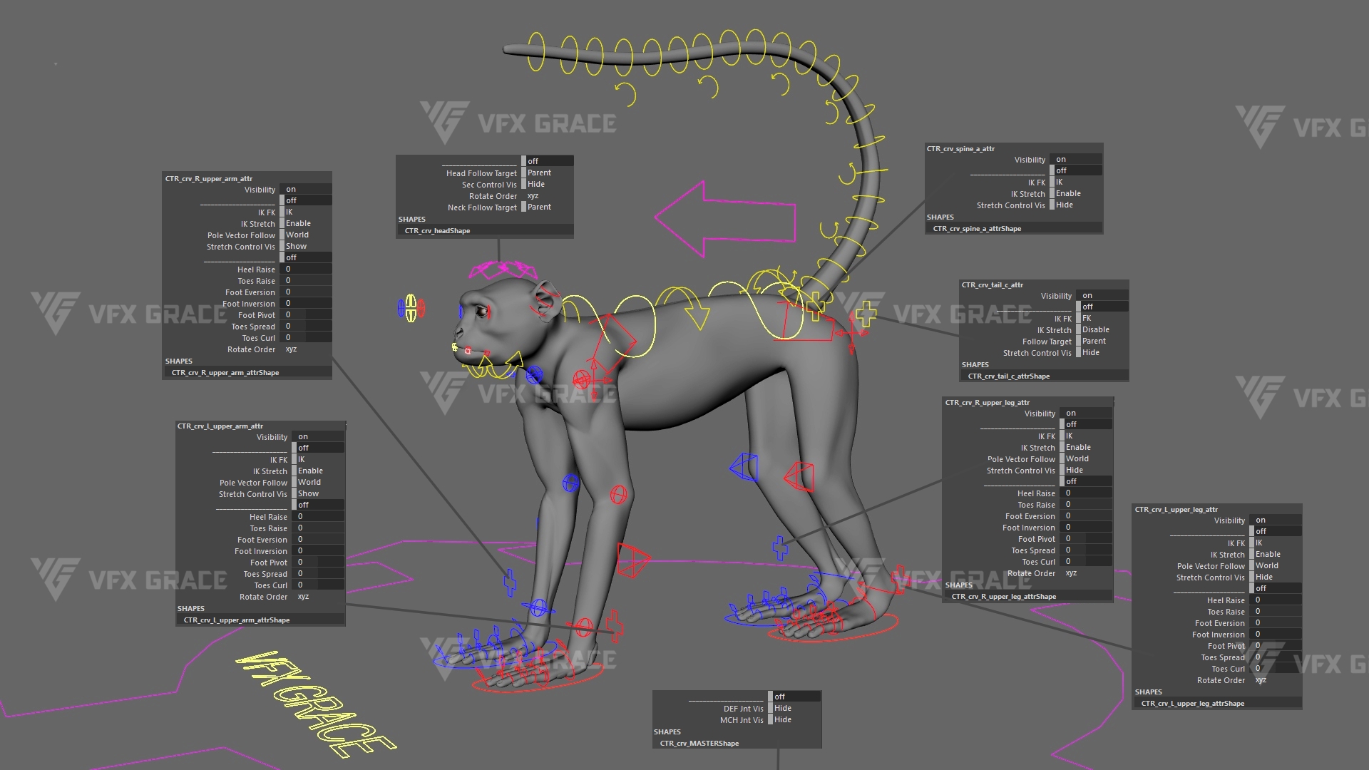 CTR_crv_MASTER: Controls the entire model, it comes with customized attributes: "DEF_Jnt_Vis" (Deformation Joint Visibility), and "MCH_Jnt_Vis" (Mechanism Joint Visibility).
