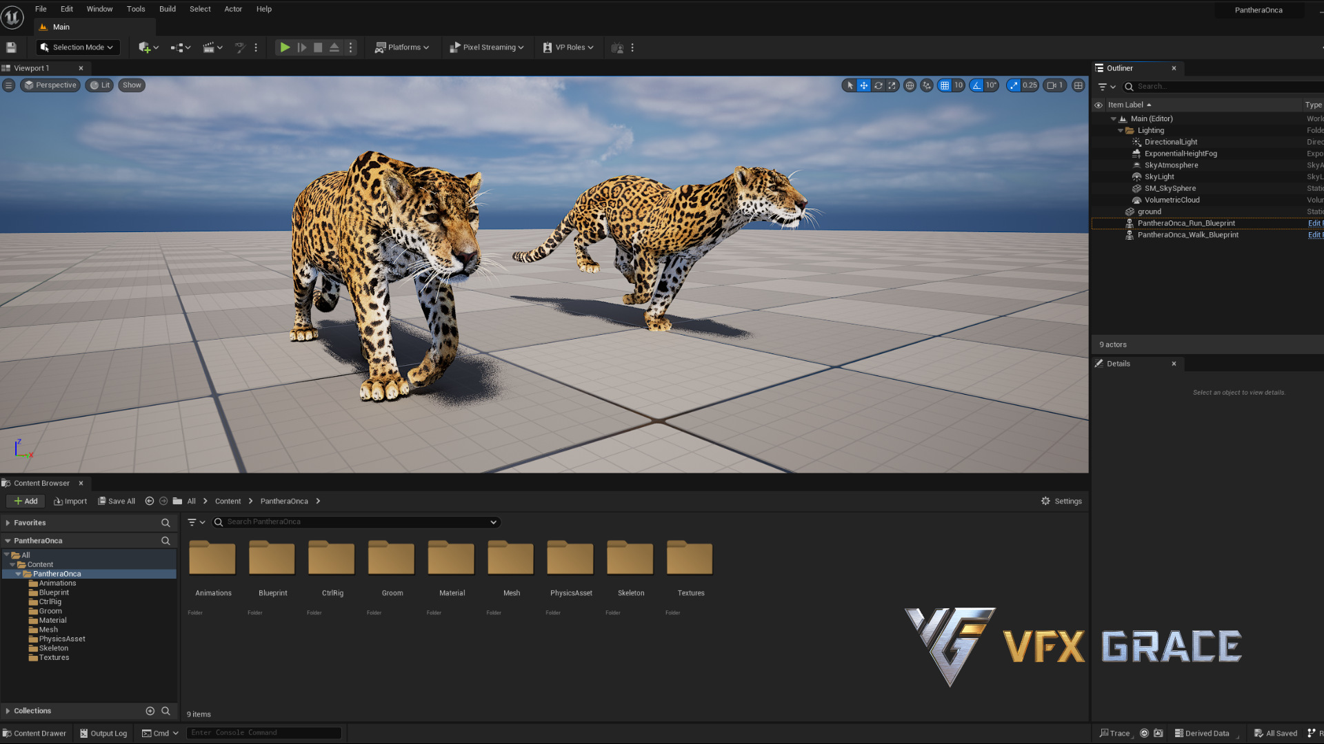 Groom Fur: A complex fur system was created in Blender, and the jaguar's fur styling has been perfectly replicated using UE's Groom technology, with finely tuned materials.