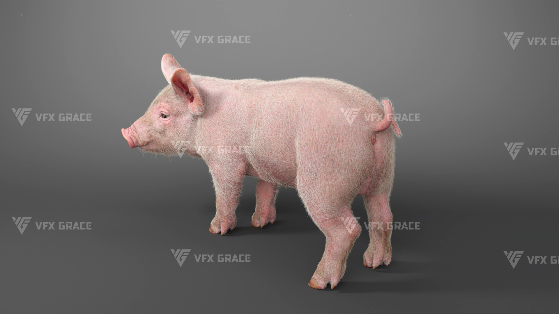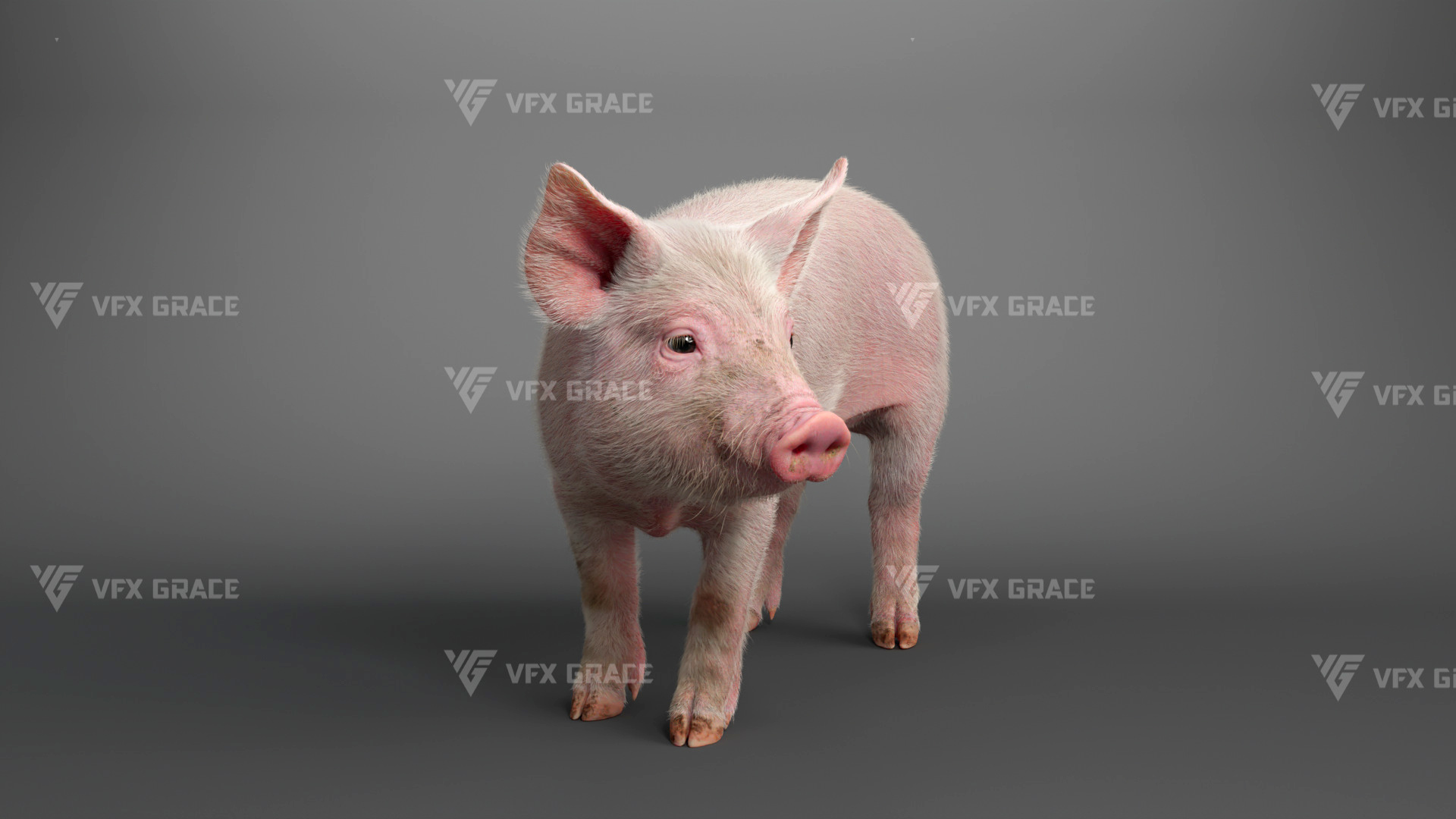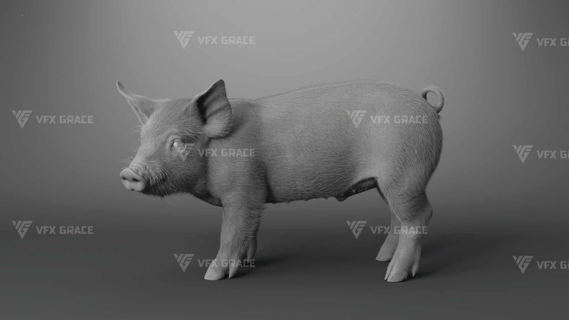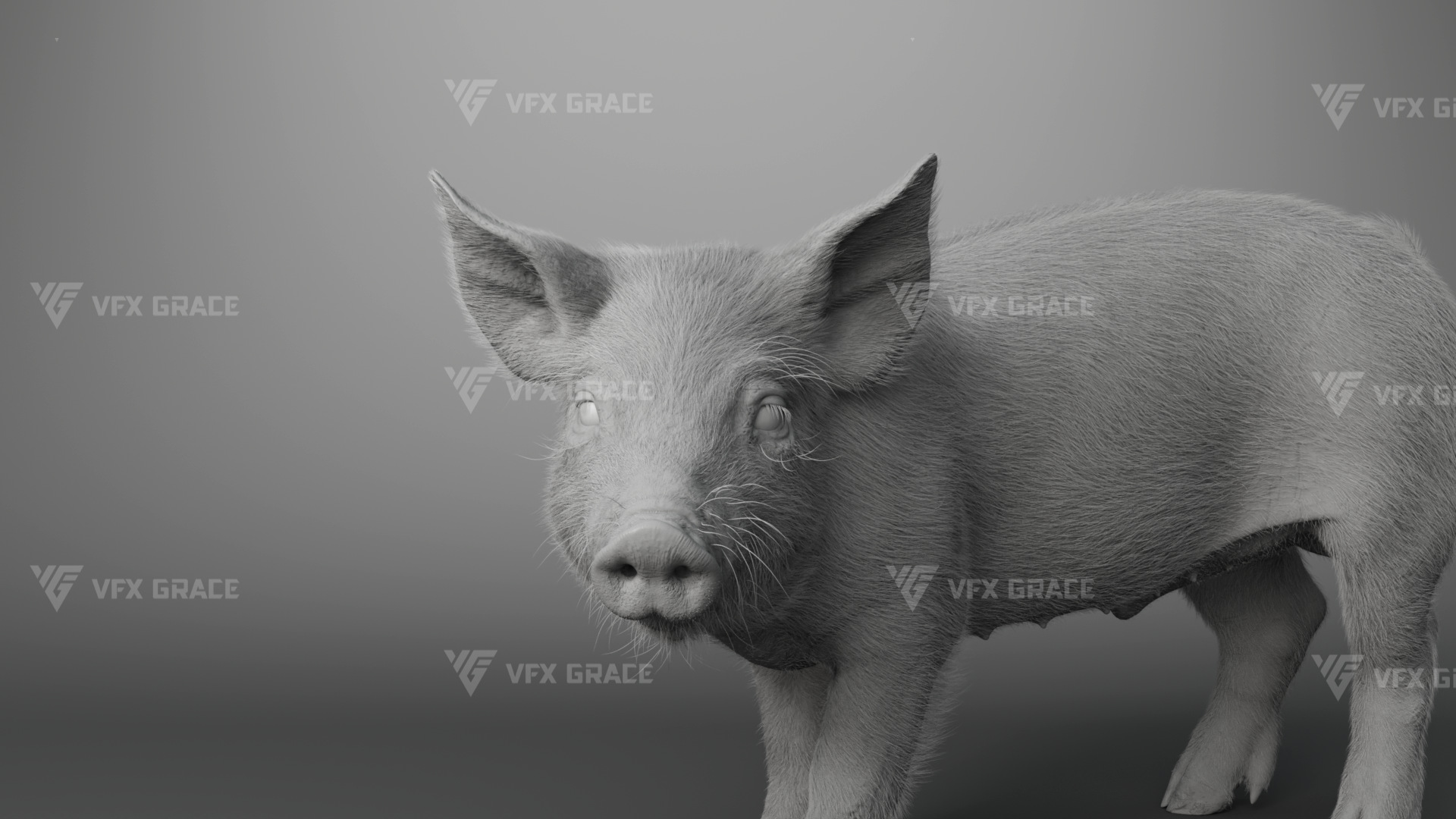 This is a high-quality young piglet character, including the model, textures, hair, rigging, and animations. All hair is created using XGen Interactive, delivering detailed and realistic effects. The materials are built with Arnold renderer to accurately replicate the appearance and texture of a real piglet. The rigging is created with reference to real bones, making the animation in line with natural movements. The project provides a complete rigging setup along with five realistic animations. This character was created at real-world scale using Maya 2024, suitable for film, animation, and high-precision character presentation.