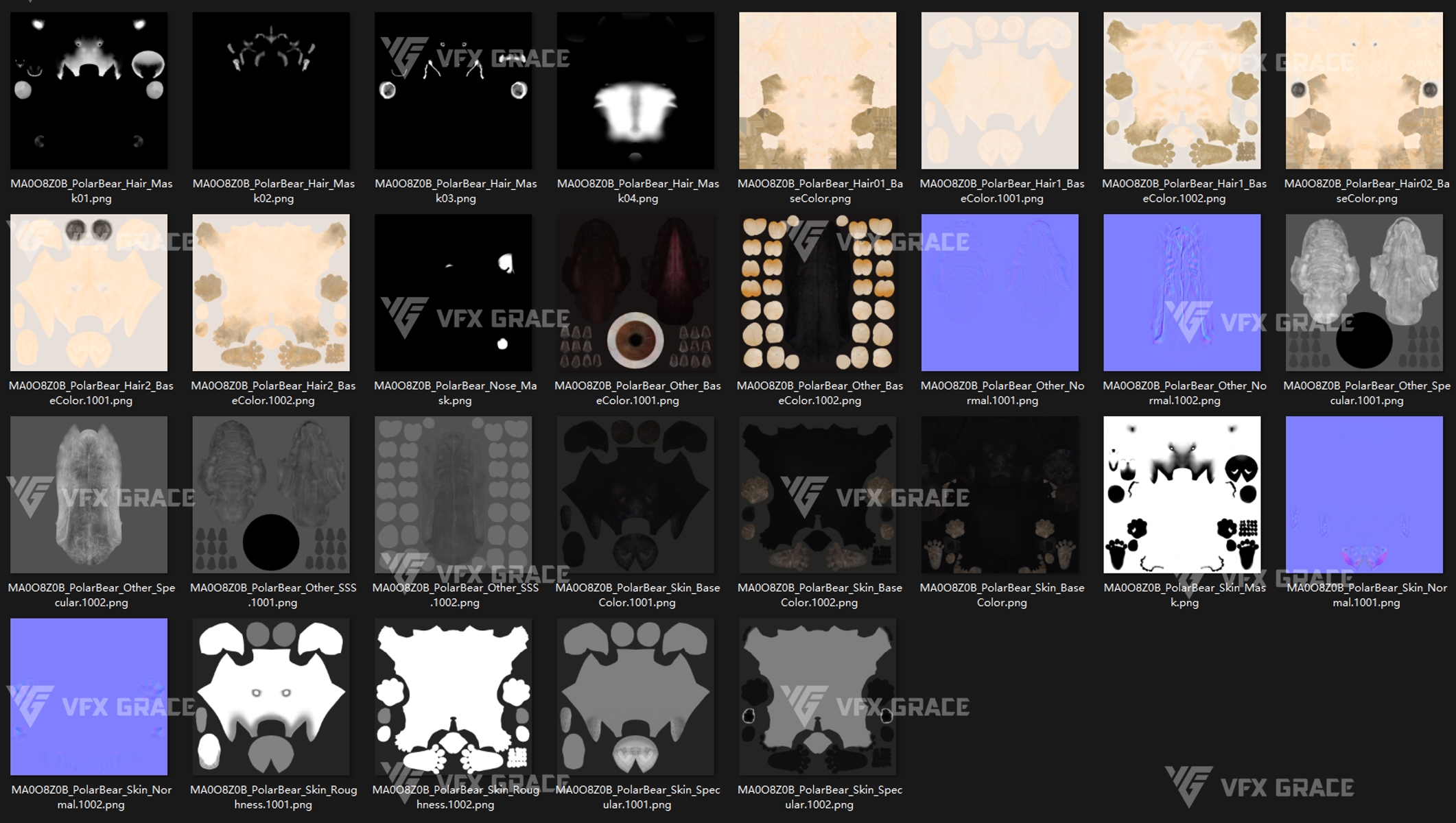 XGen hair: XGen interactive is used for presenting the details of the hair faster, and all maps of density and modifier masks for hair layering are included externally, all masks are in 1K resolution.