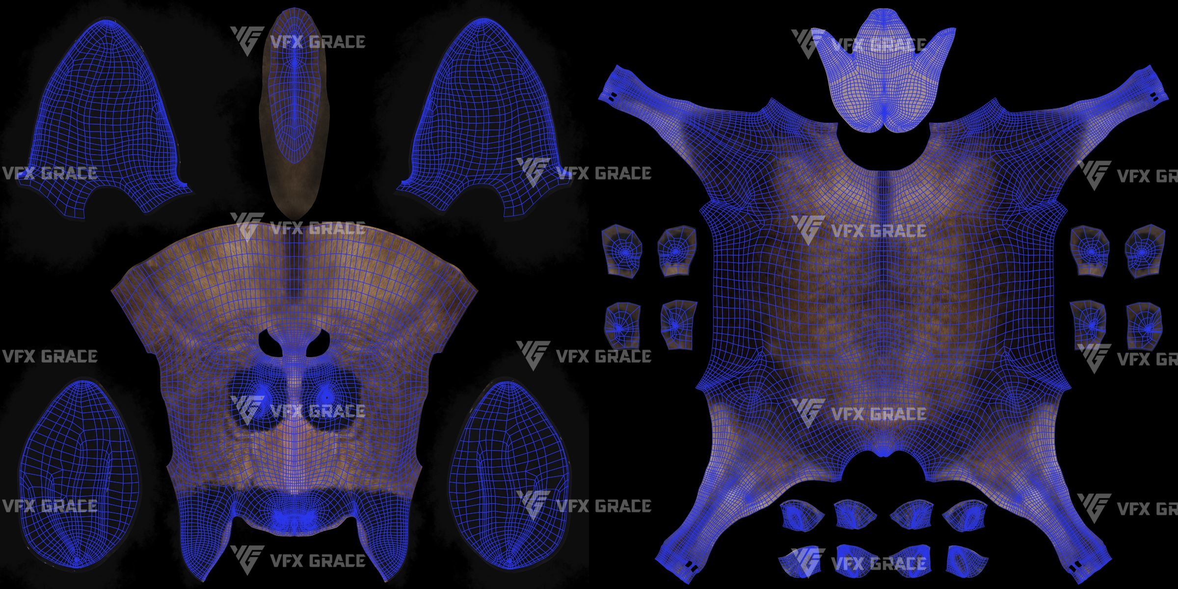XGen hair: XGen interactive is used for presenting the details of the hair faster, and all maps of density and modifier masks for hair layering are included externally, all masks are in 1K resolution.