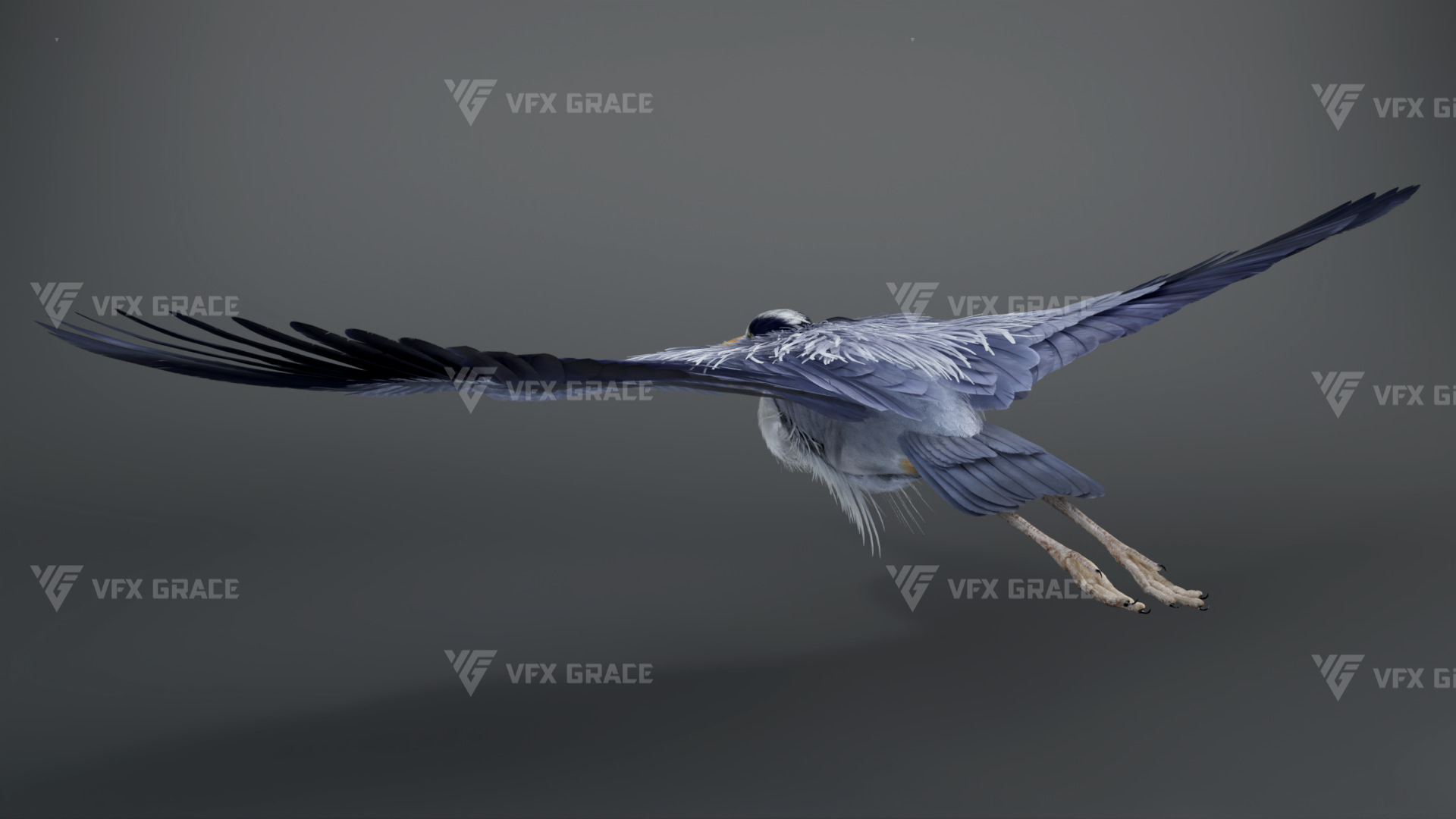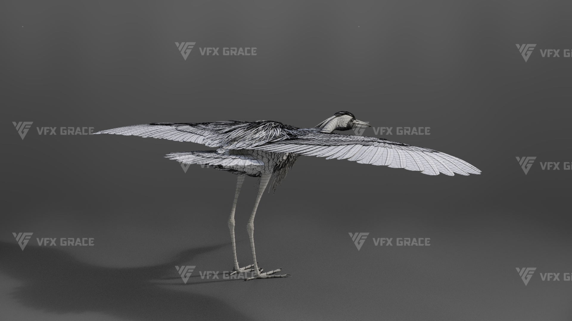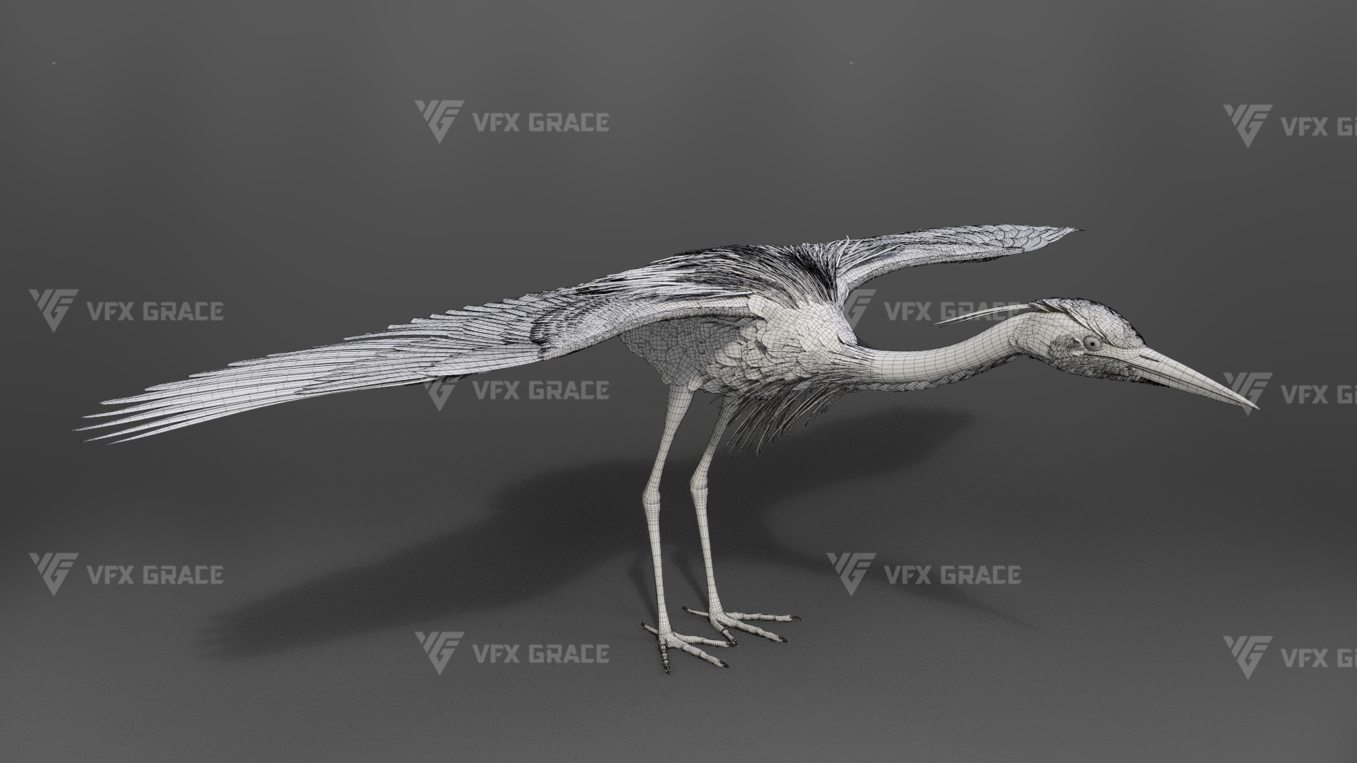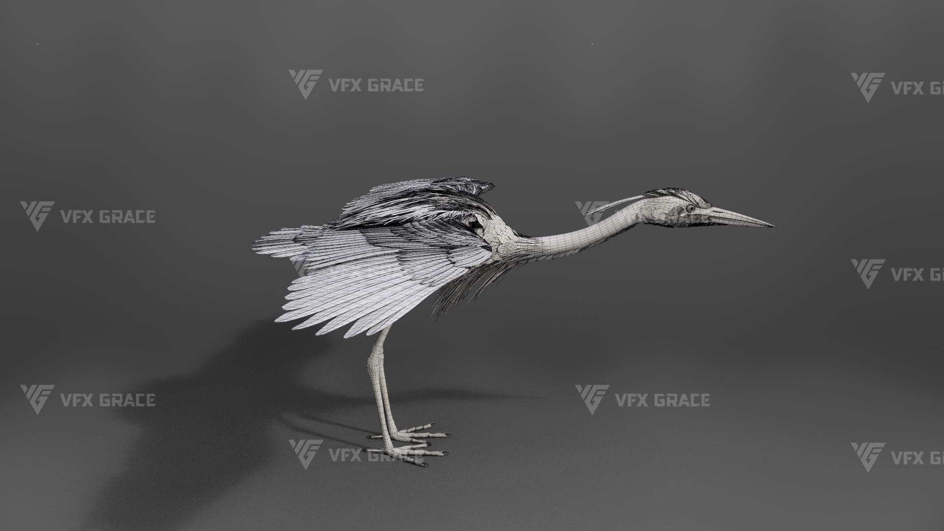 This is a high-quality grey heron character, including the model, textures, hair, rigging, and animation. The hair is created in XGen interactive with enough details, and all materials are built with Arnold renderer for realistically replicating the appearance and texture of a real mellivora. The rigging is created with reference to real bones, making the animation in line with natural movements. The project provides a complete rigging setup along with one flying animation. This character was created at real-world scale using Maya 2024, suitable for film, animation, and high-precision character presentation scenarios.