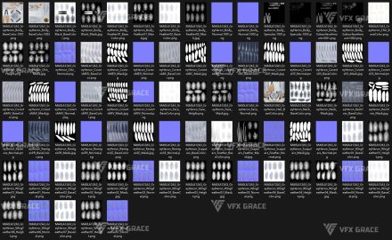 XGen hair: XGen interactive is used for presenting the details of the hair faster, and all maps of density and modifier masks for hair layering are included externally, all masks are in 1K resolution.