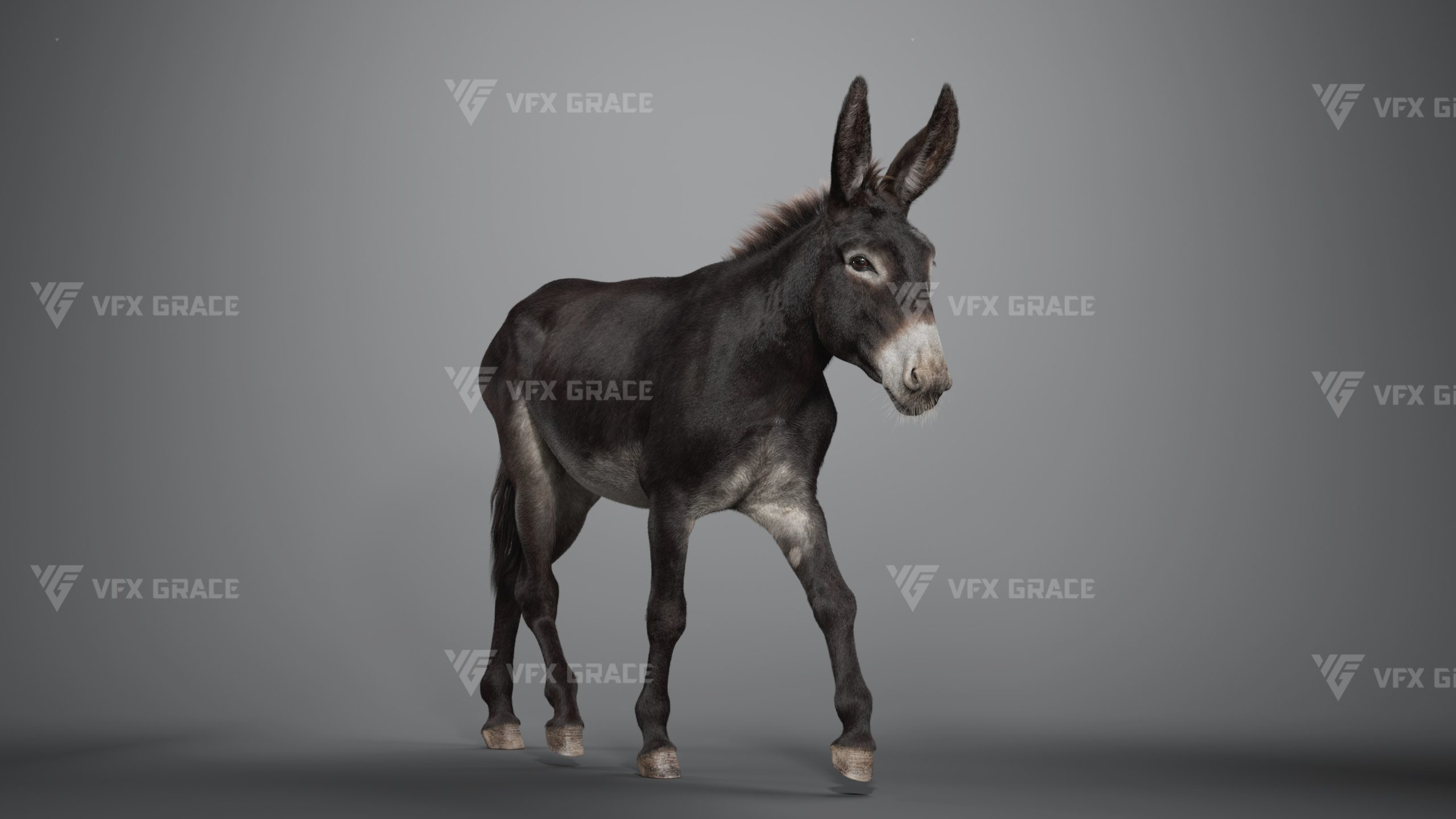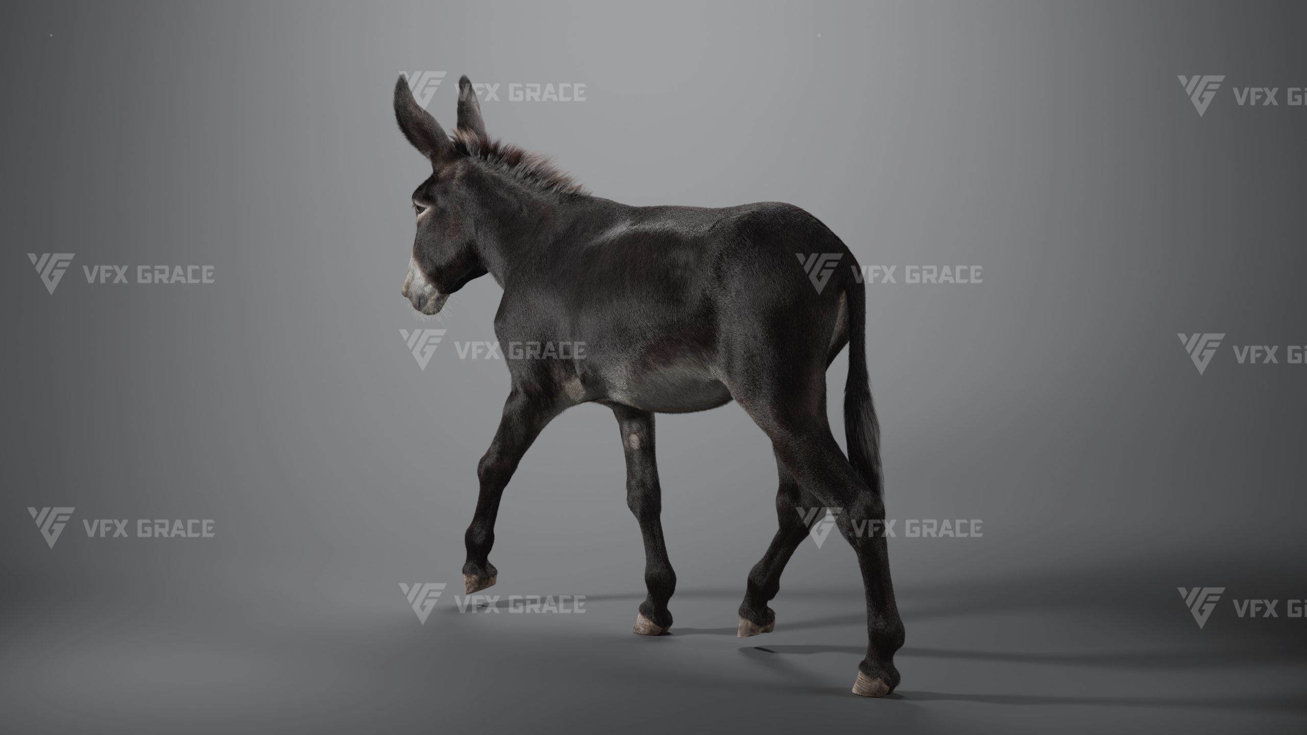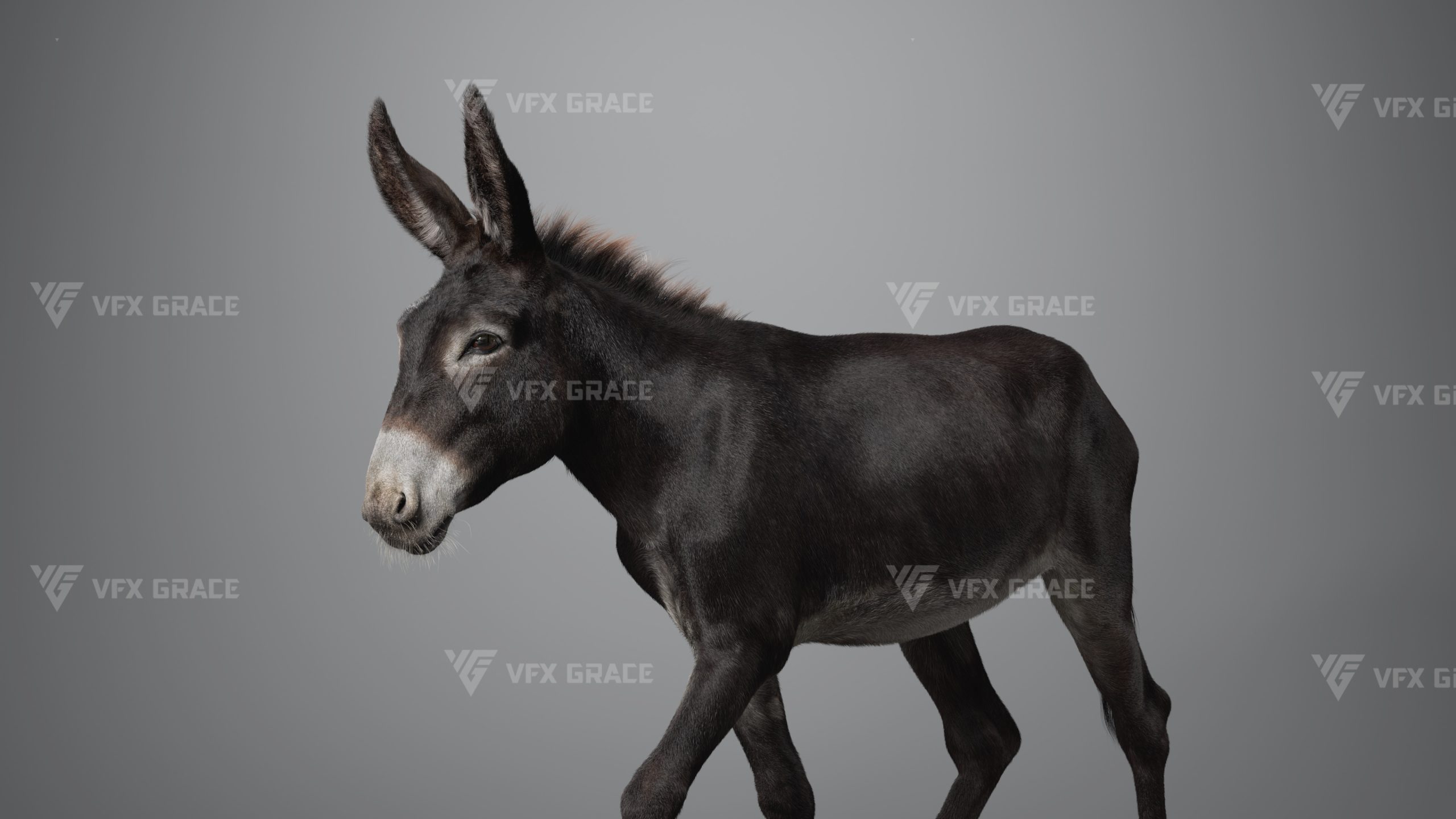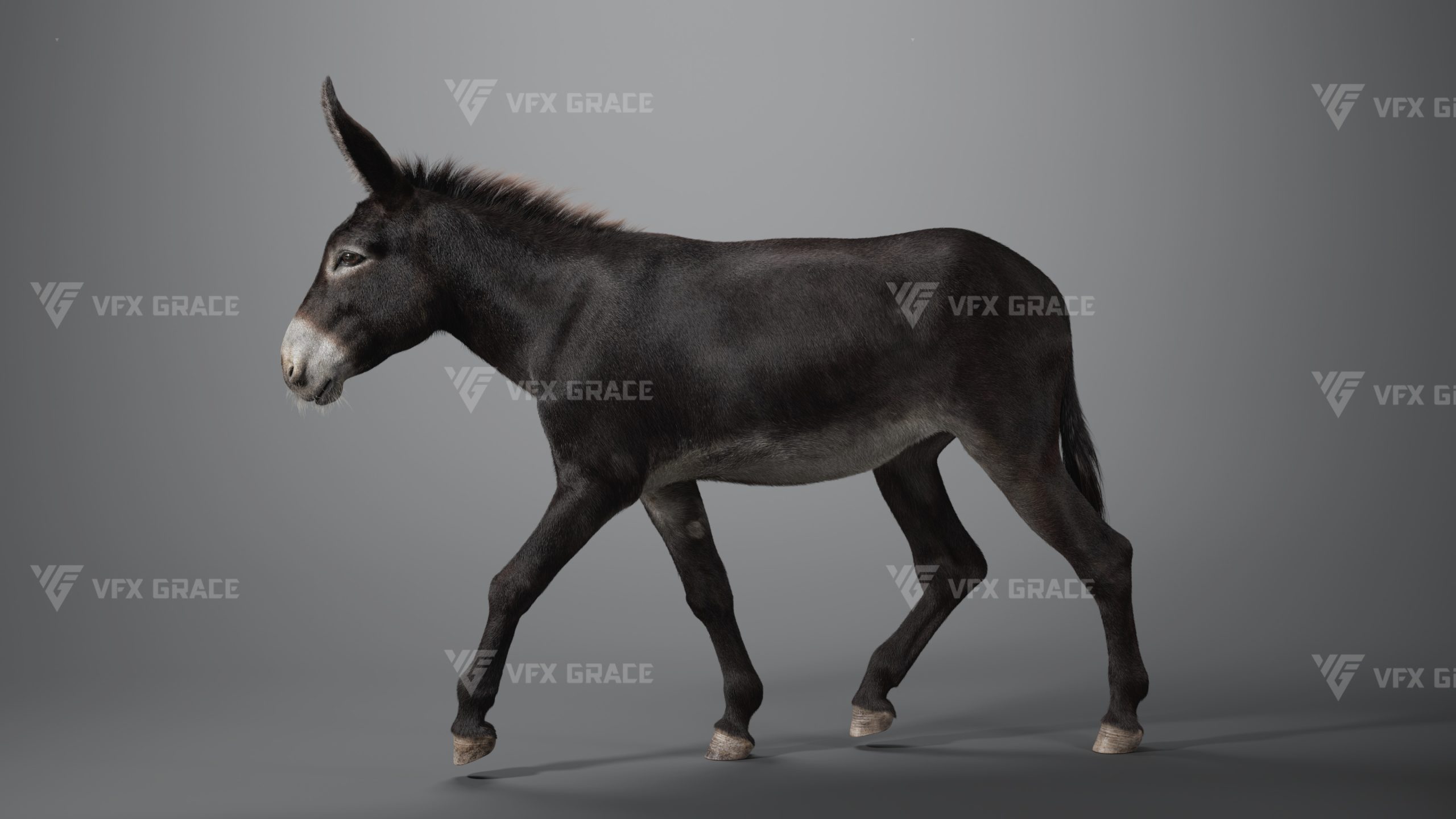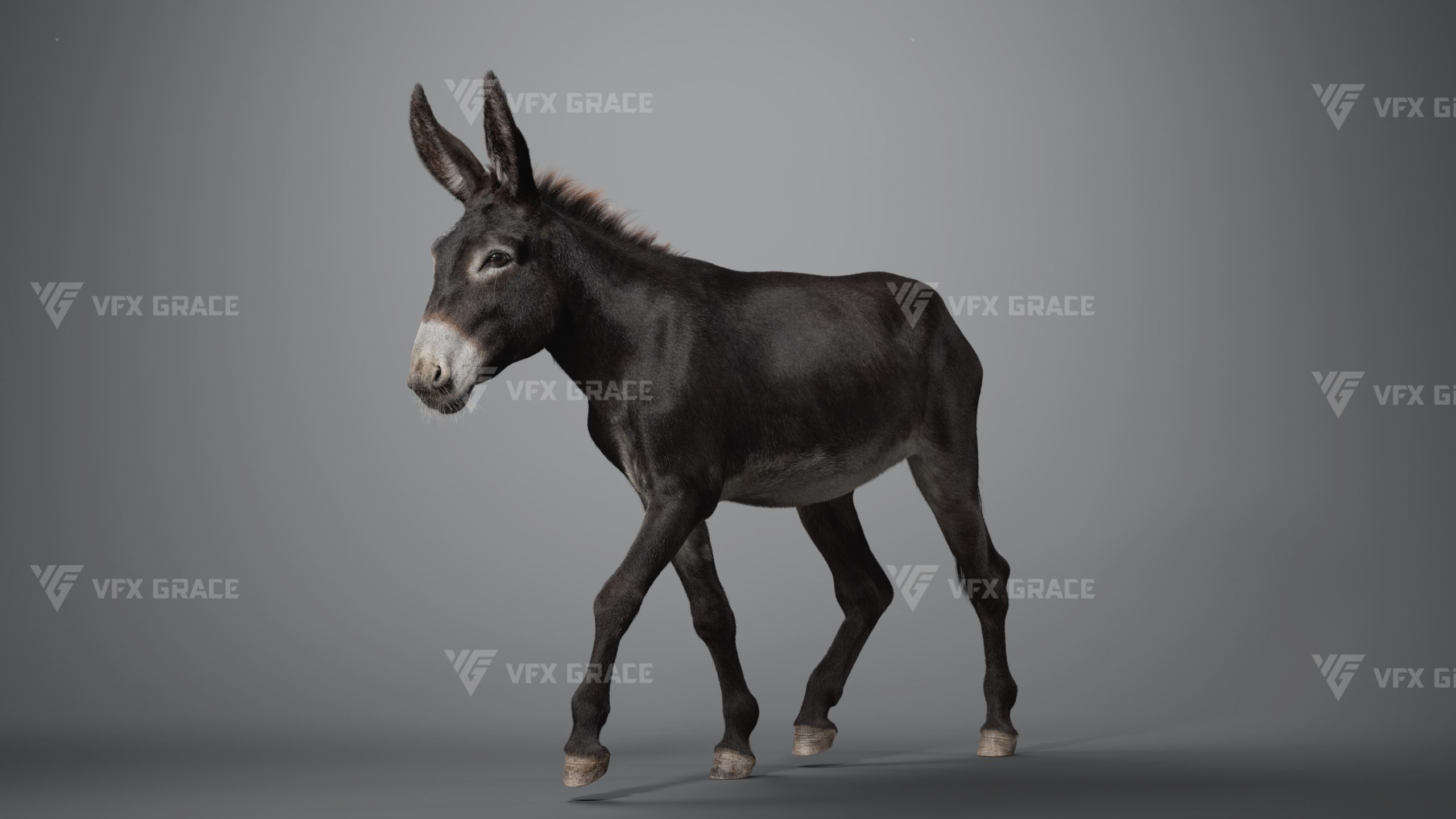 This is a high-quality donkey character. The project includes the model, textures, hair, rigging, and animations. All hair is created using the XGen Interactive Groom system with enough details. The character materials are built with the Arnold renderer to accurately reproduce realistic surface detail. The rig is constructed based on realistic skeletal proportions, making the animation more consistent with natural movement. The project provides a complete rigged project and four realistic animations. This character is created with Maya 2024 at real-world scale and is suitable for film, animation, and high-precision character presentation.