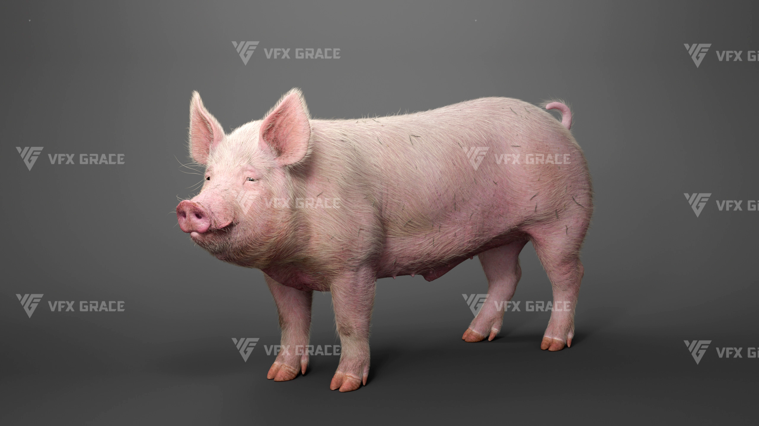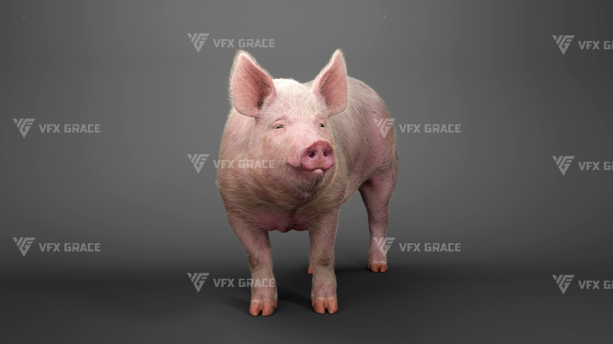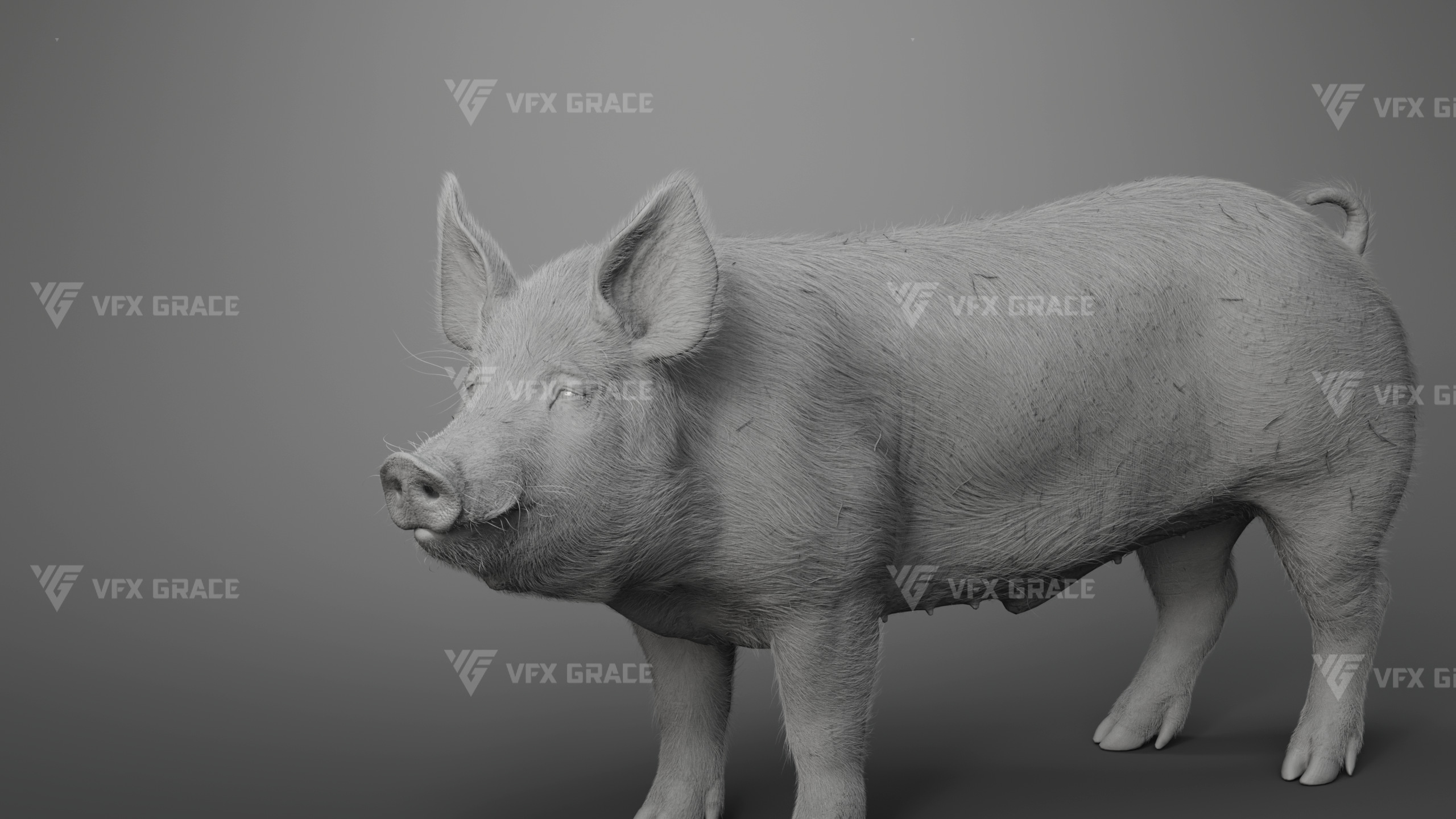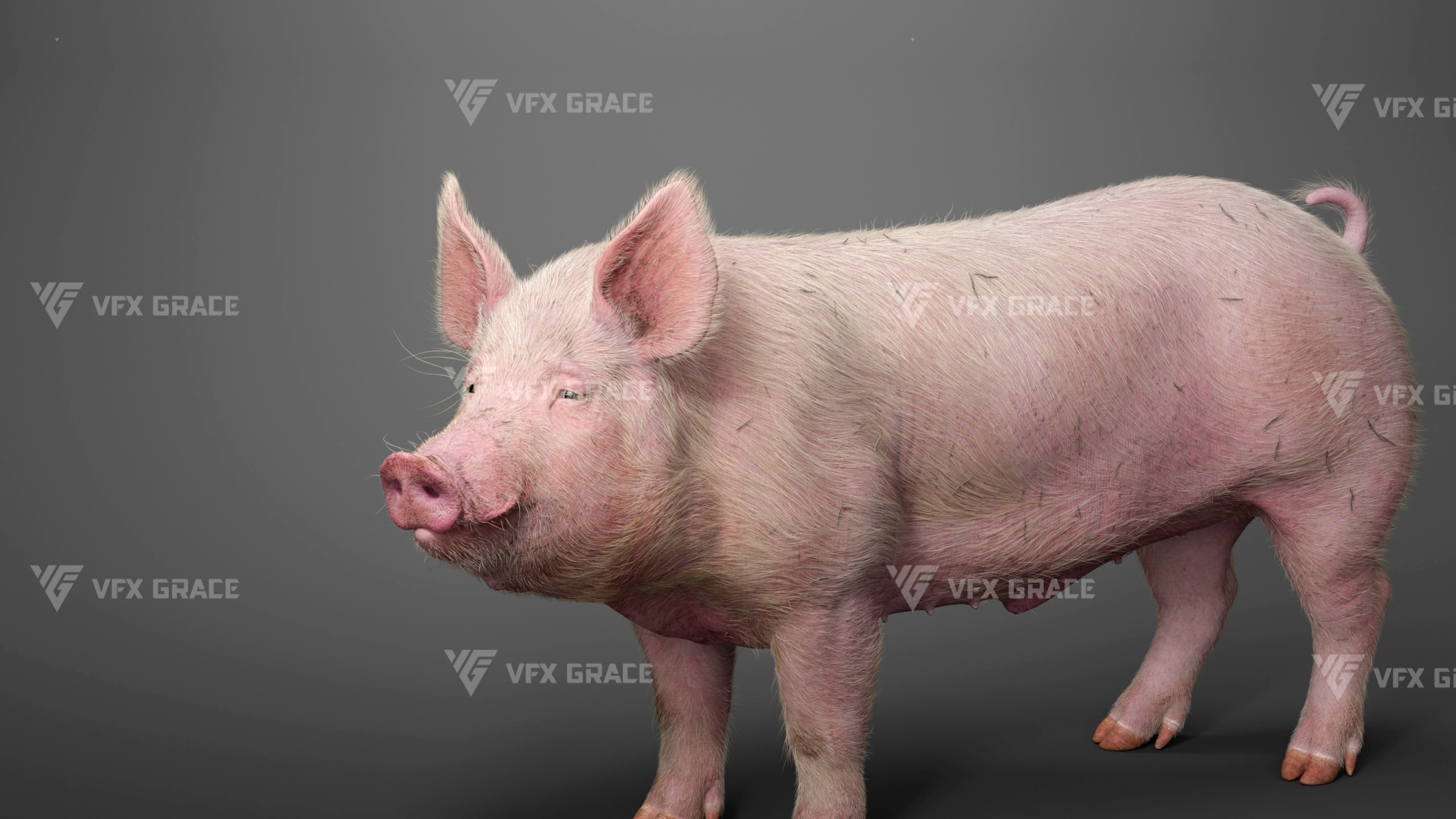 This is a high-quality male domestic pig character, including the model, textures, hair, rigging, and animations. All hair is created using XGen Interactive, delivering detailed and realistic effects. The materials are built with Arnold renderer to accurately replicate the appearance and texture of a real domestic pig. The rigging is created with reference to real bones, making the animation in line with natural movements. The project provides a complete rigging setup along with seven realistic animations. This character was created at real-world scale using Maya 2024, suitable for film, animation, and high-precision character presentation.