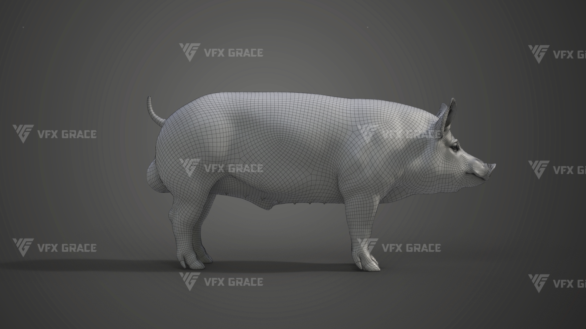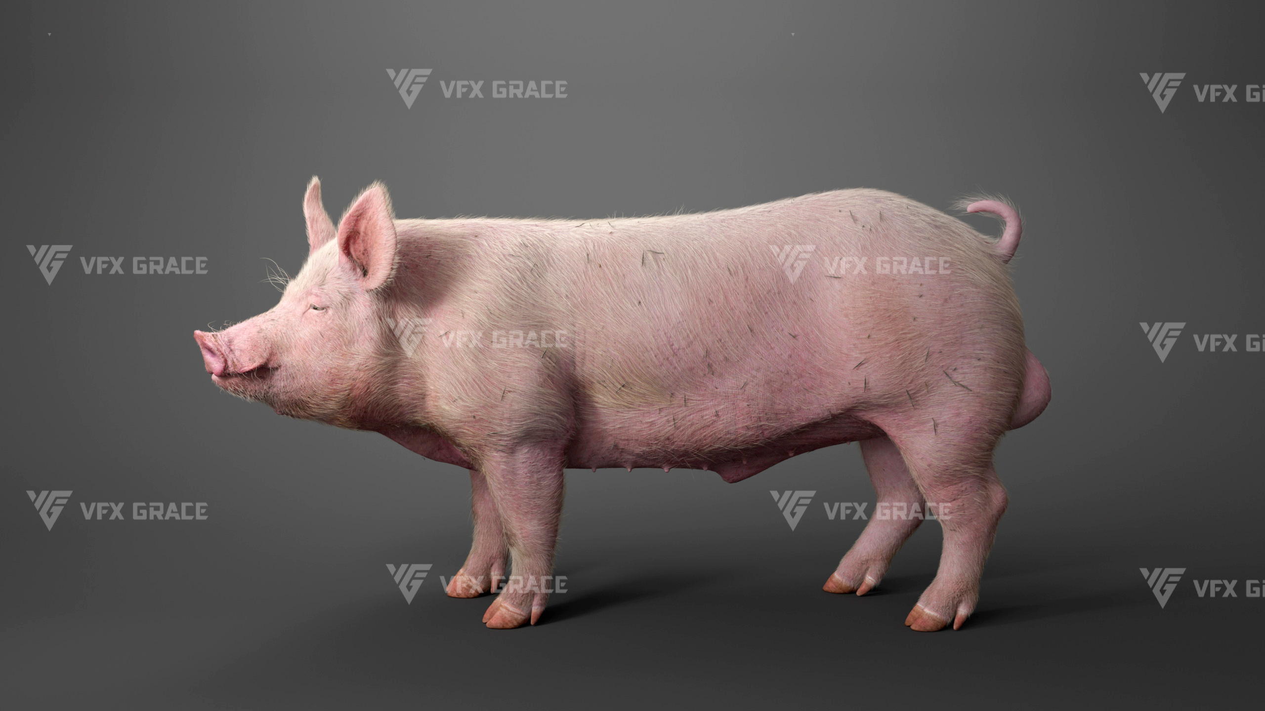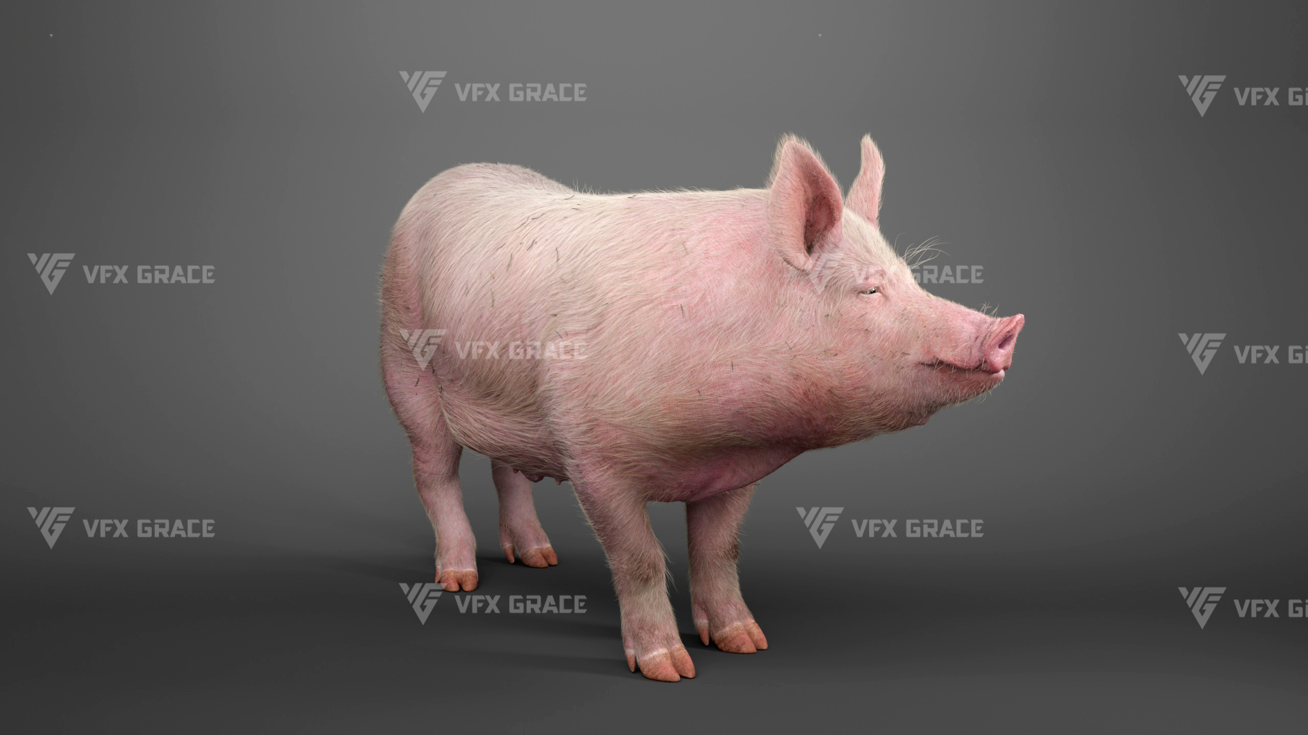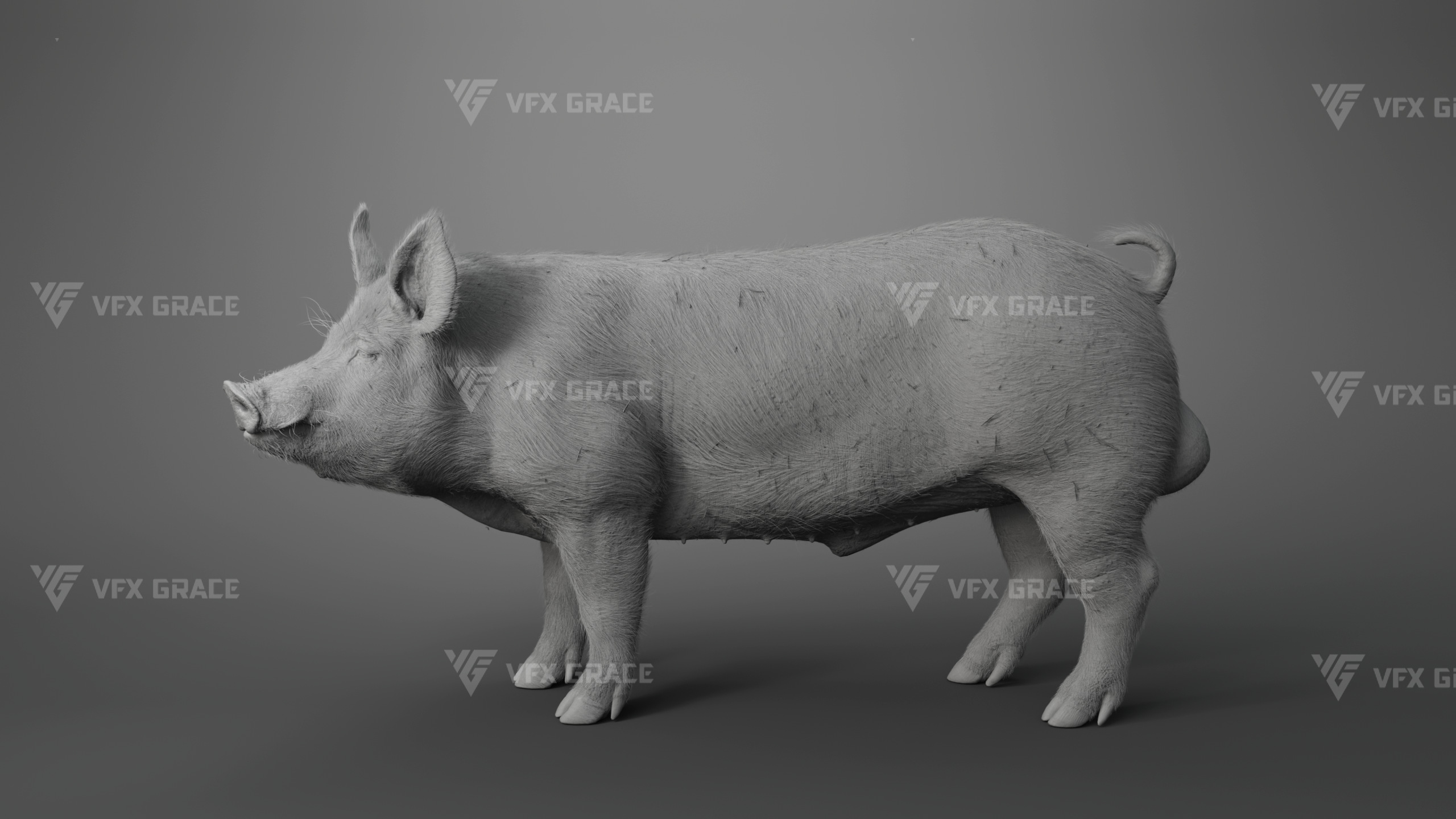 This is a high-quality male domestic pig character, including the model, textures, hair, rigging, and animations. All hair is created using XGen Interactive, delivering detailed and realistic effects. The materials are built with Arnold renderer to accurately replicate the appearance and texture of a real domestic pig. The rigging is created with reference to real bones, making the animation in line with natural movements. The project provides a complete rigging setup along with seven realistic animations. This character was created at real-world scale using Maya 2024, suitable for film, animation, and high-precision character presentation.