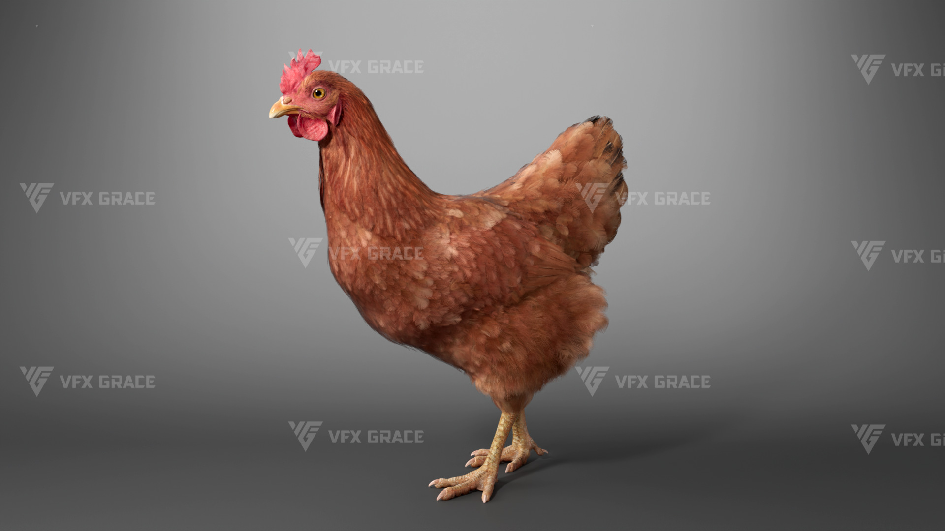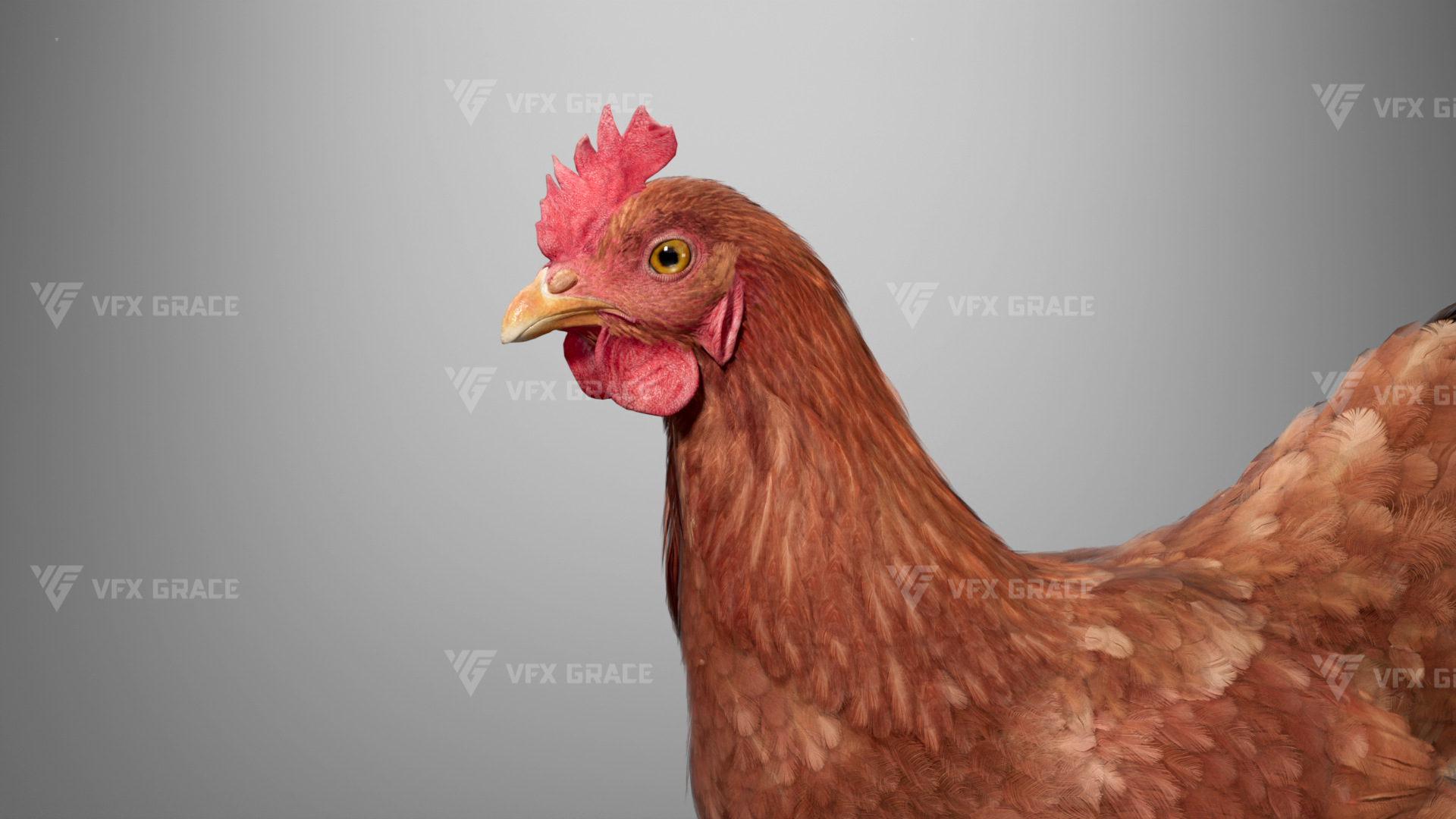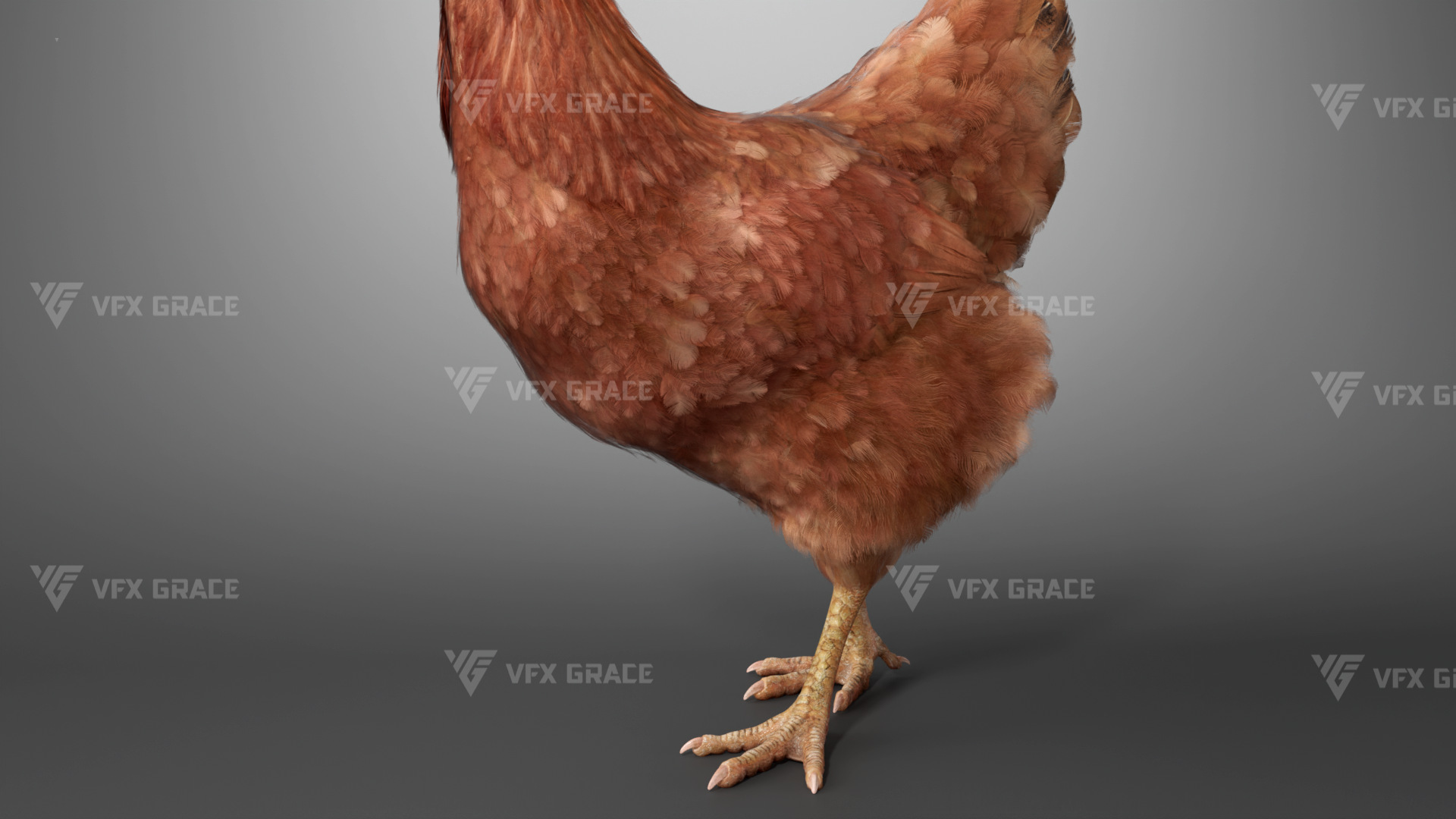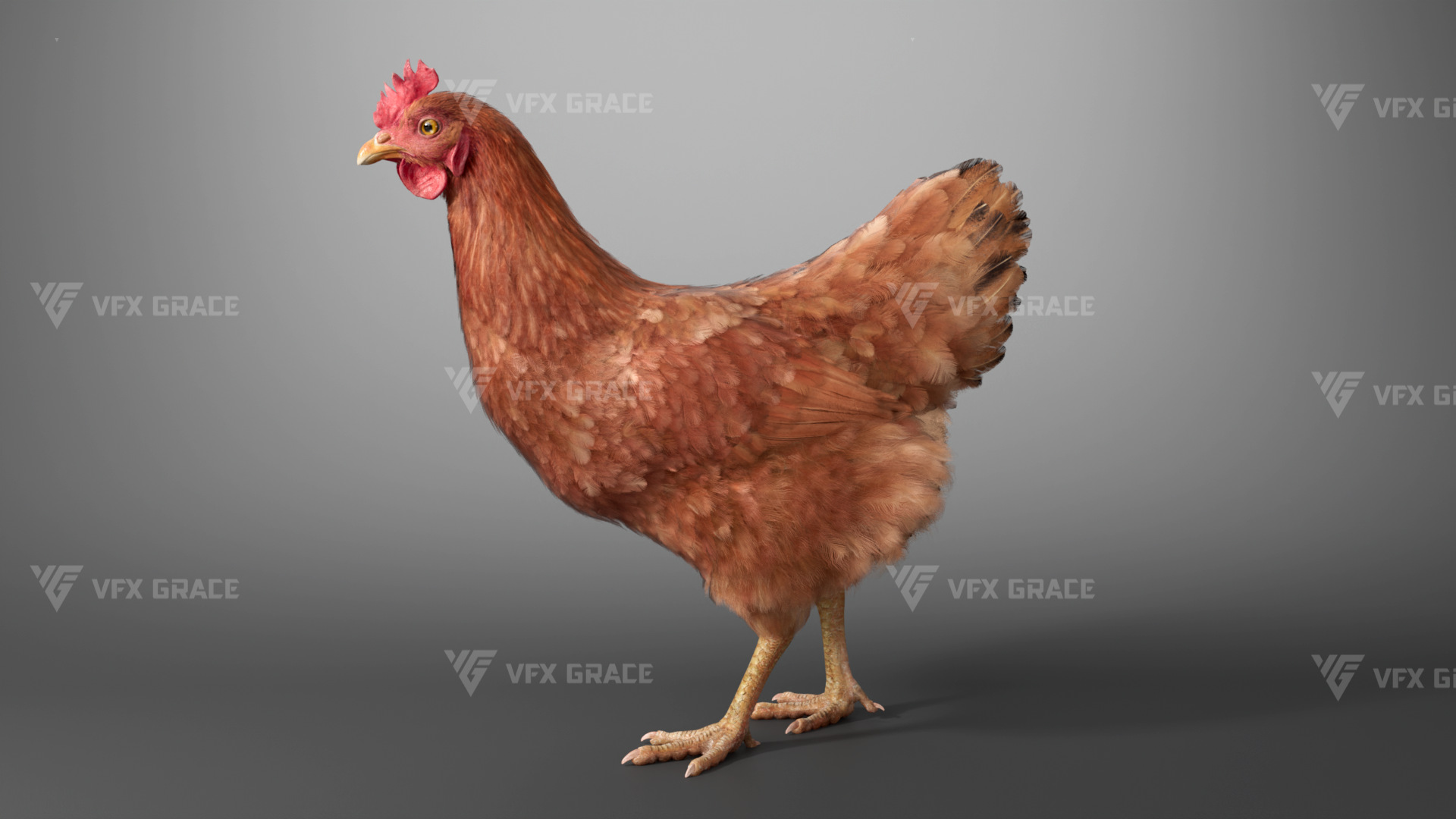 This is a high-quality red hen character, featuring the model, textures, feather cards, rigging, and animations. All feathers are arranged based on real-life references, with the body feathers created using feather cards. All materials are rendered with Arnold renderer to achieve realistic effects. The rigging is equipped with pre-set wing-folding controllers, making the animations more in line with natural movement. The project provides the rigging and 3 realistic animations. The model is created with Maya 2024 at real-world scale.