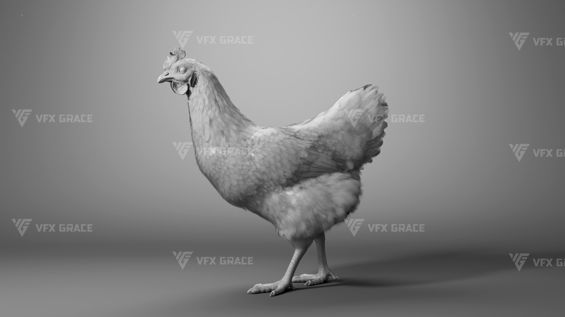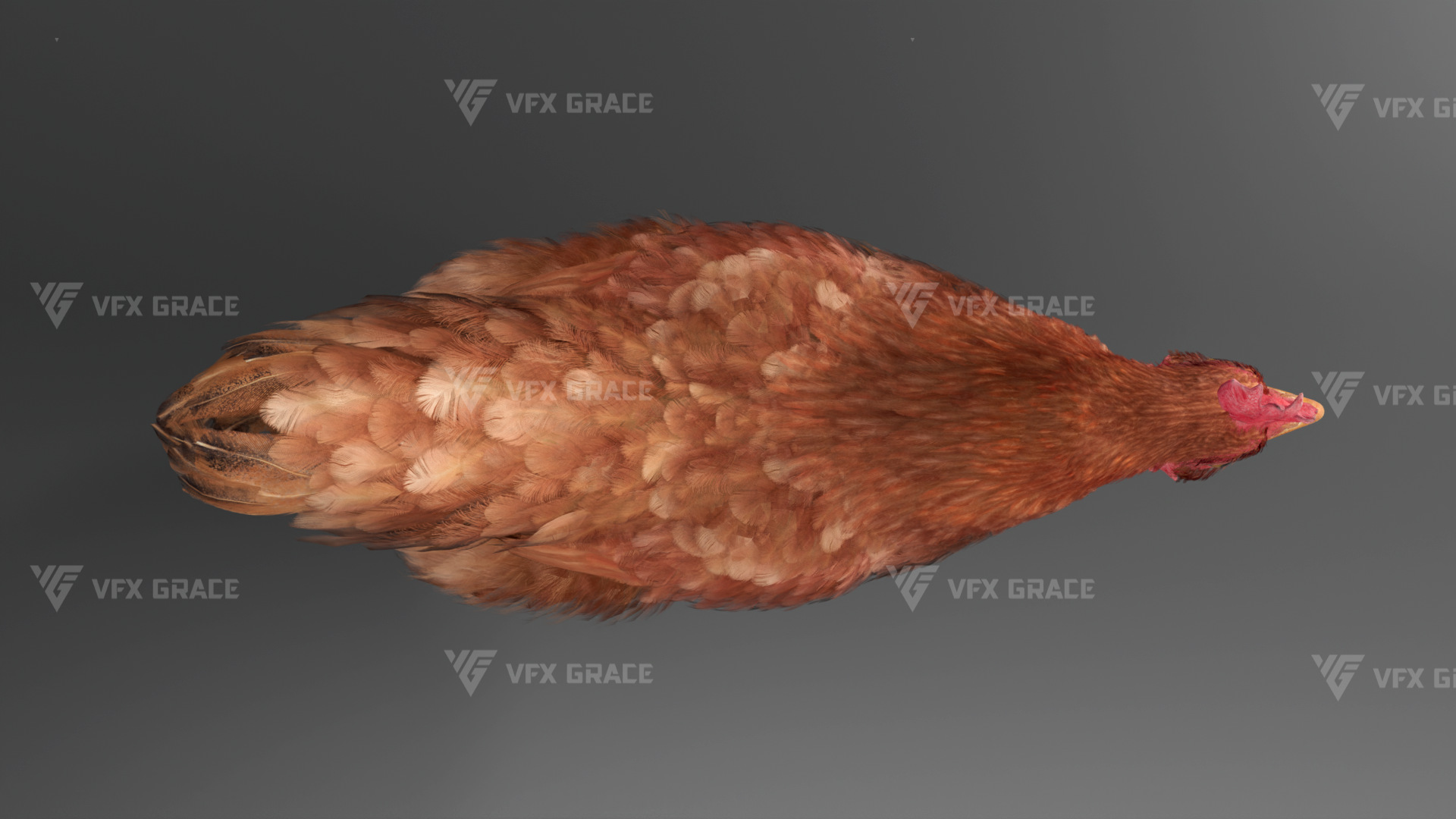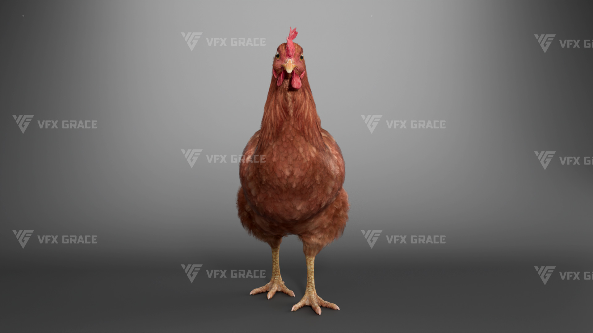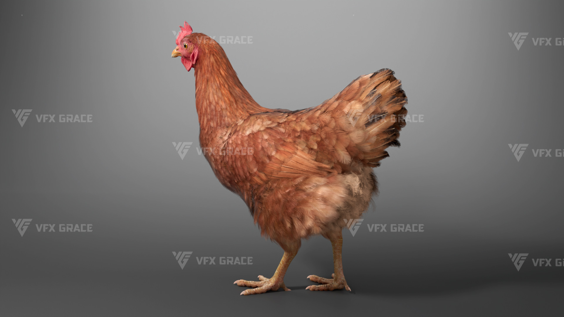 This is a high-quality red hen character, featuring the model, textures, feather cards, rigging, and animations. All feathers are arranged based on real-life references, with the body feathers created using feather cards. All materials are rendered with Arnold renderer to achieve realistic effects. The rigging is equipped with pre-set wing-folding controllers, making the animations more in line with natural movement. The project provides the rigging and 3 realistic animations. The model is created with Maya 2024 at real-world scale.