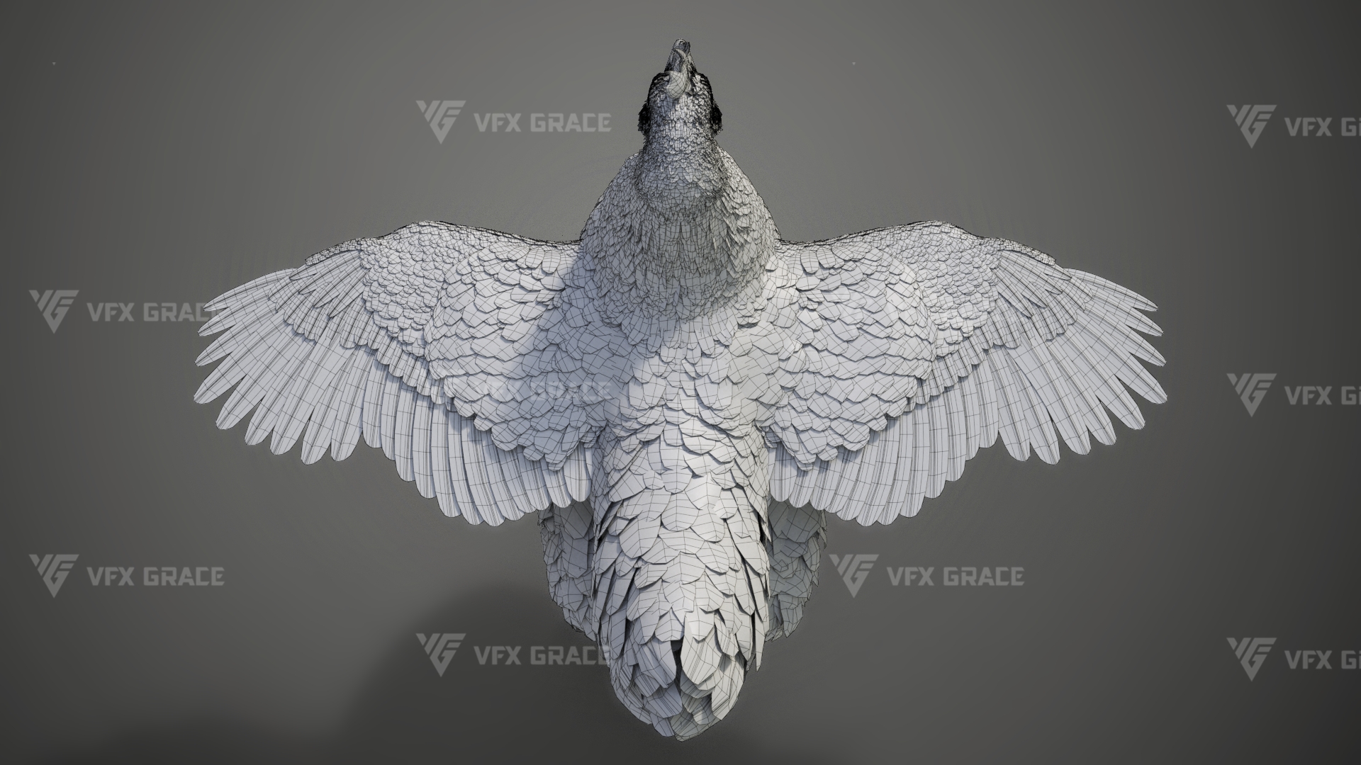 Model Details: The model consists of the body, claws, lacrimal glands, pupils, sclerae, third eyelids, tongue, and multiple sets of feathers.