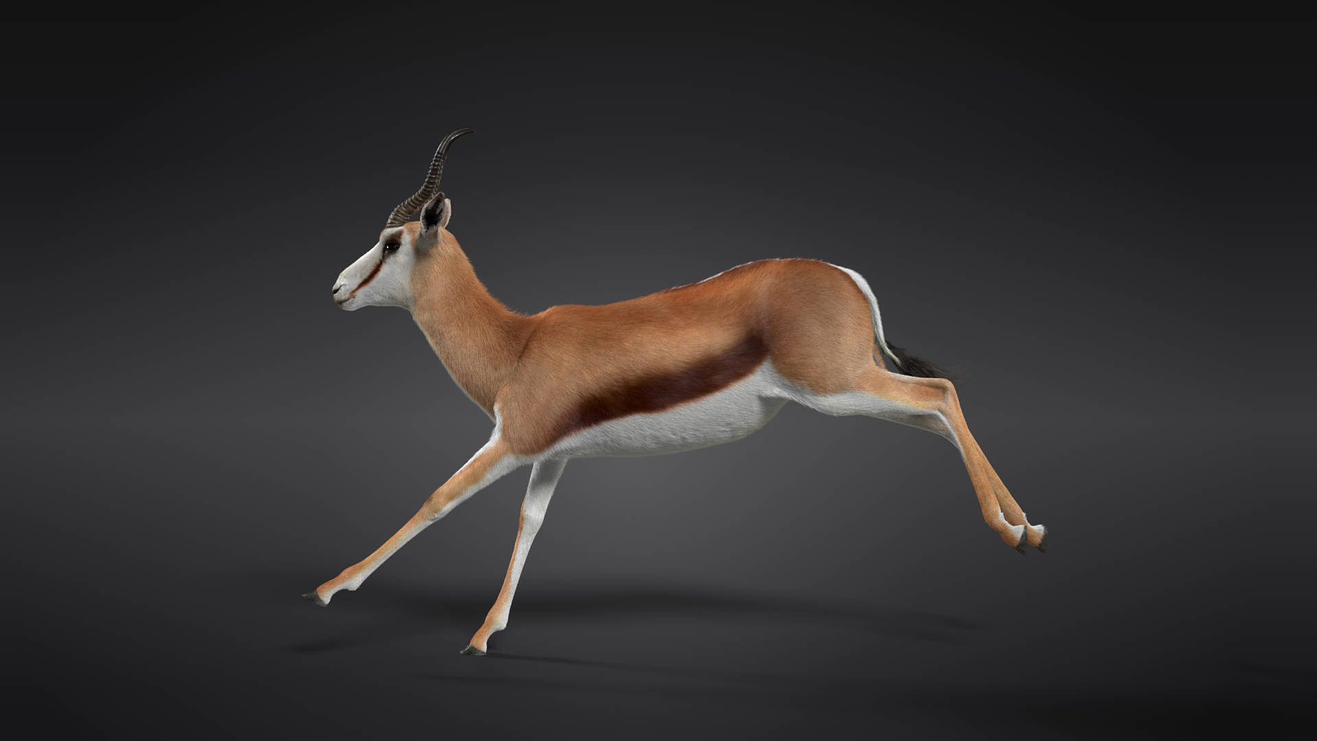 This is a realistic springbok 3D model with multiple texture maps, rigging, animation, and fur. It is made with Blender and Cycles renderer at real-world scale.