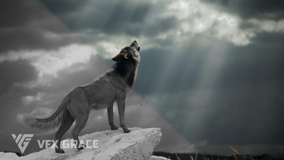 Groom Fur: A complex fur system was created in Blender, and the wolf's fur styling has been perfectly replicated using UE's Groom technology, with finely tuned materials.