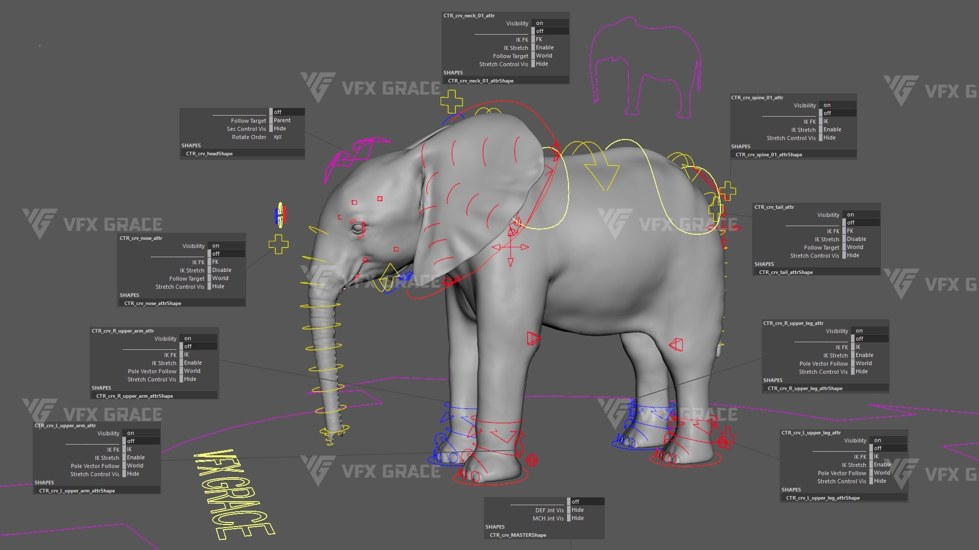 CTR_crv_MASTER: Controls the entire model, it comes with customized attributes: "DEF_Jnt_Vis" (Deformation Joint Visibility), and "MCH_Jnt_Vis" (Mechanism Joint Visibility).
