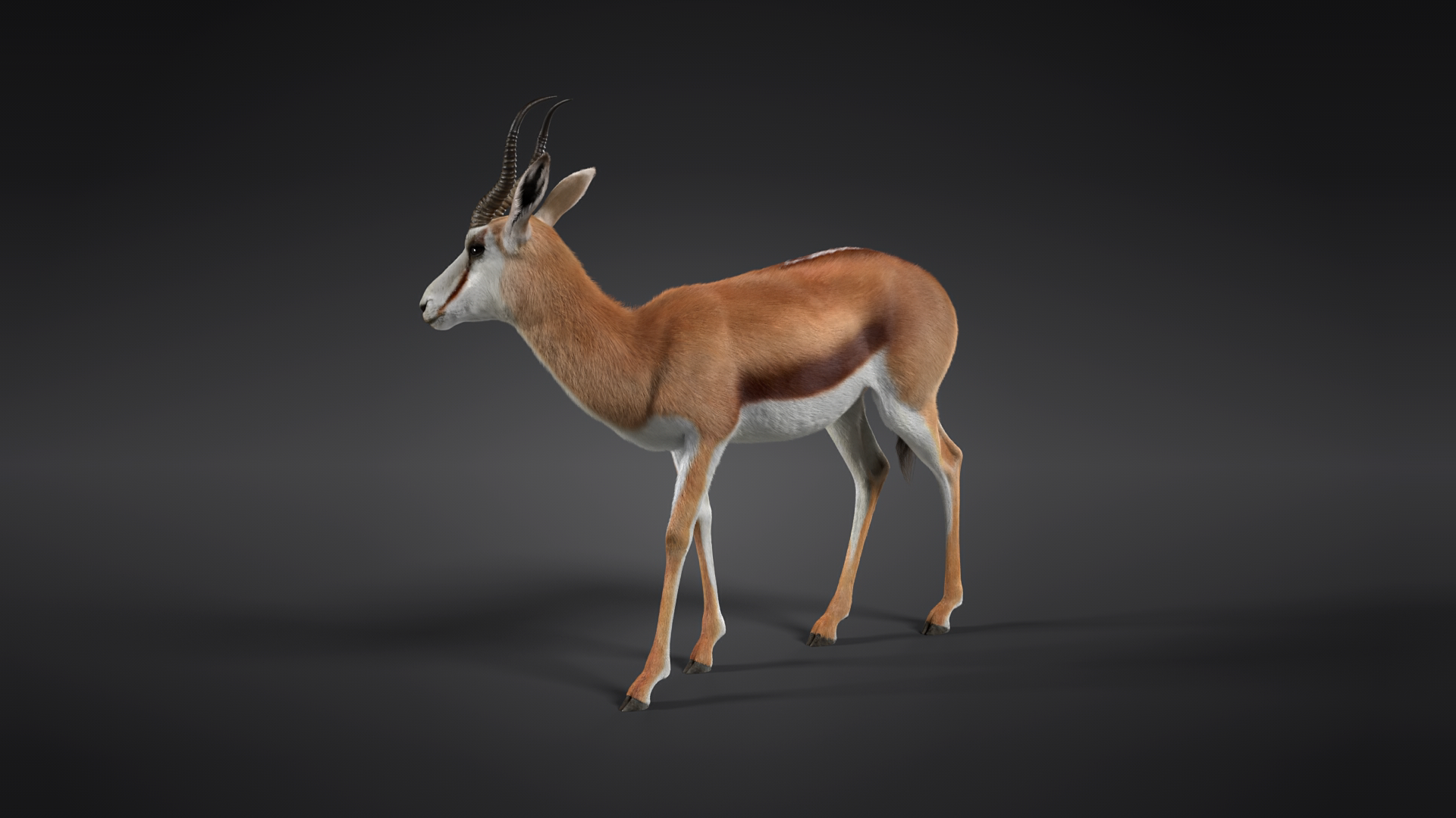 This is a realistic springbok 3D model with multiple texture maps, rigging, animation, and fur. It is made with Blender and Cycles renderer at real-world scale.